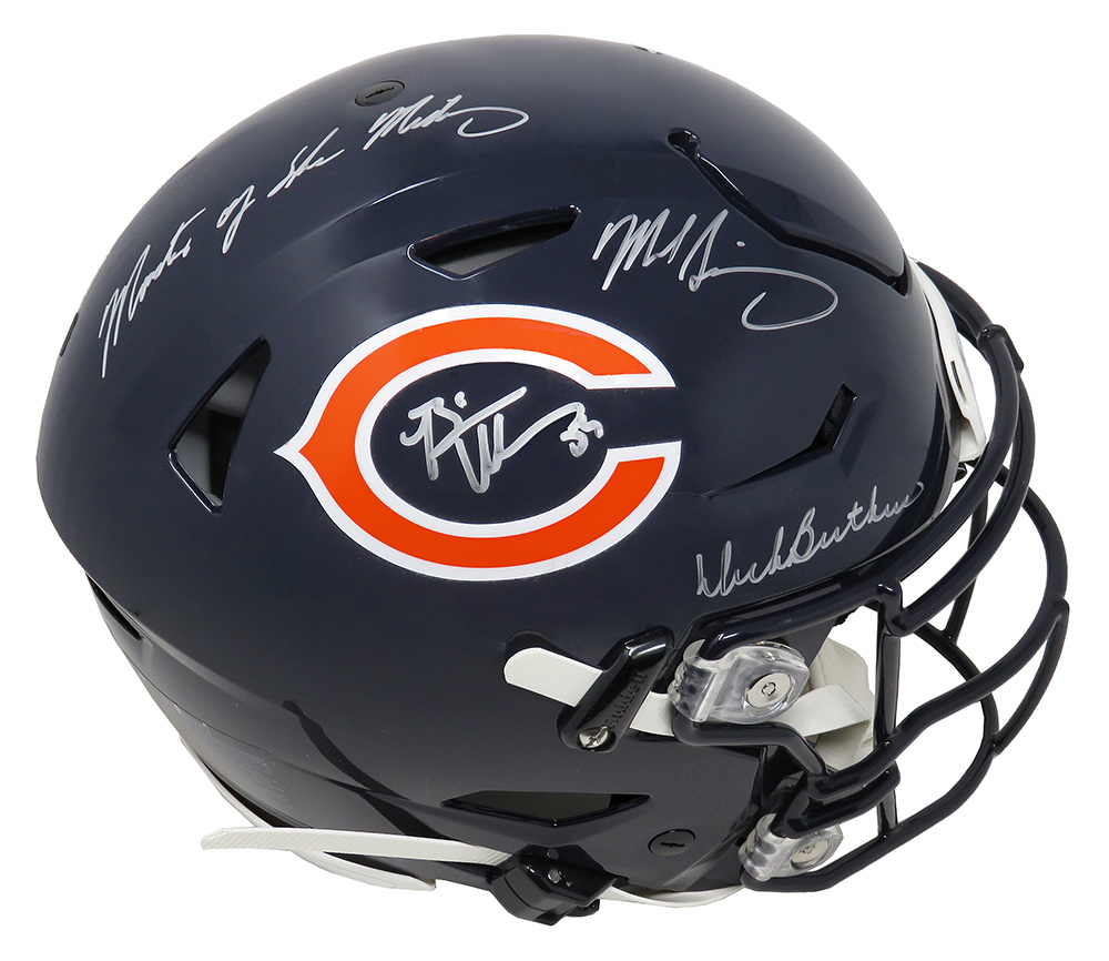 Riddell Chicago Bears full-size authentic on-field speedflex helmet. Hand-signed in silver paint pen by Dick Butkus (HOF), Mike Singletary (HOF) and Brian Urlacher (HOF).