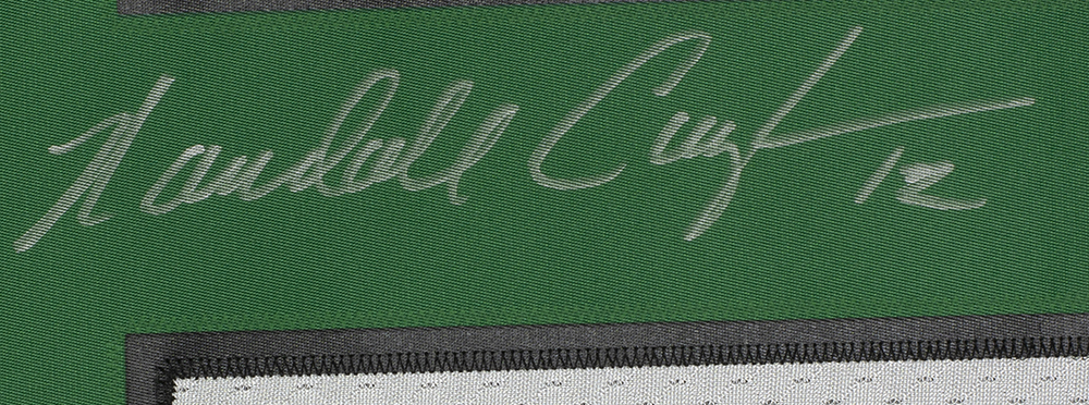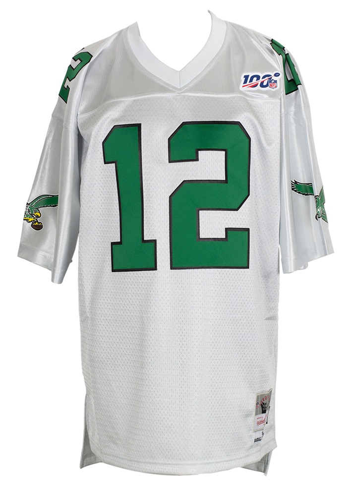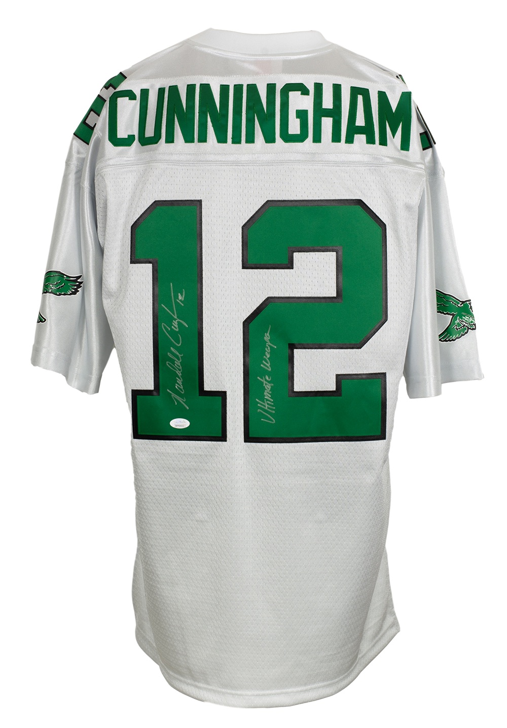Mitchell & Ness on-field style jersey with everything sewn on, size XL. Jersey has been hand-signed in silver paint pen by Randall Cunningham (Philadelphia Eagles).