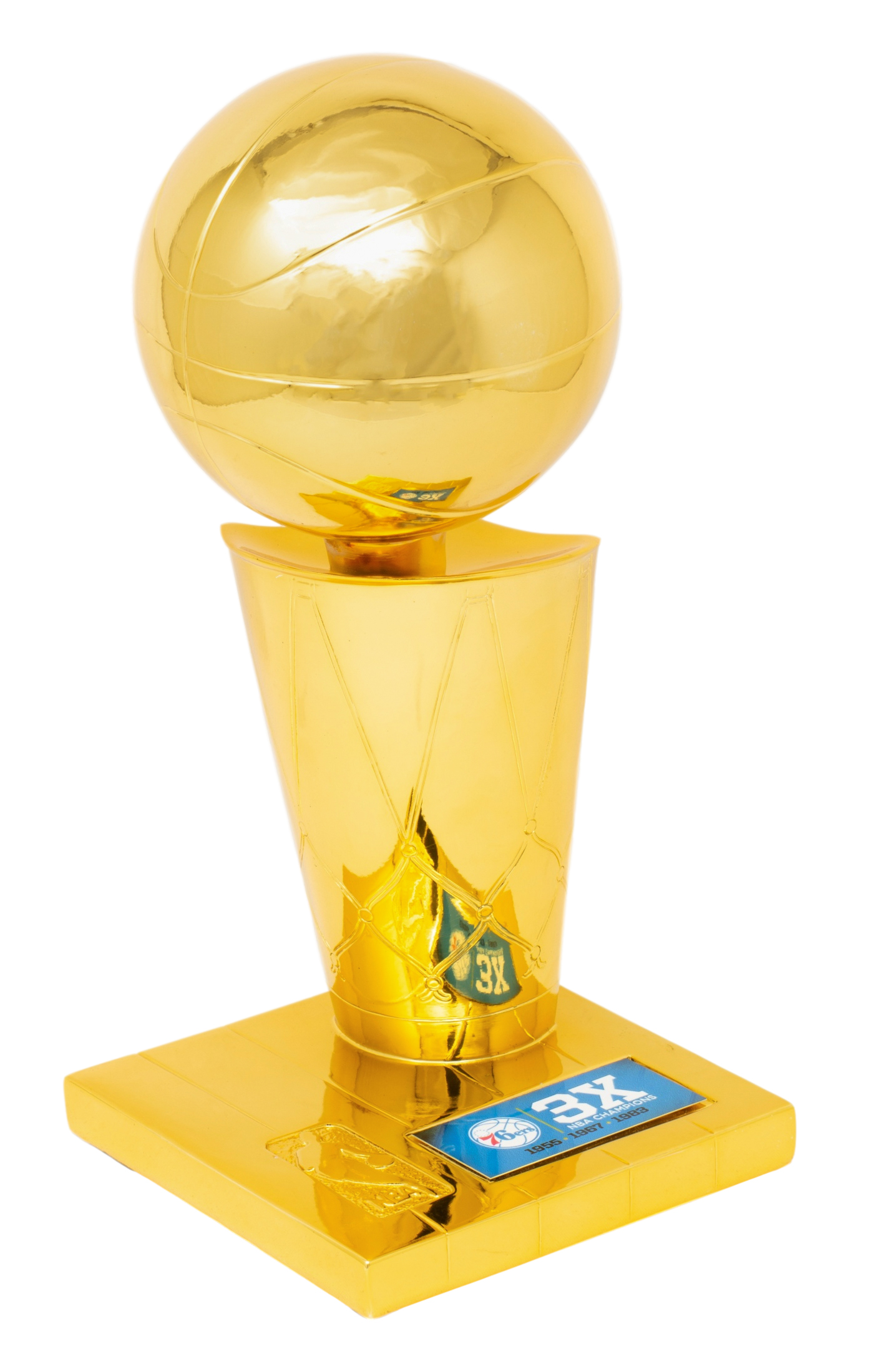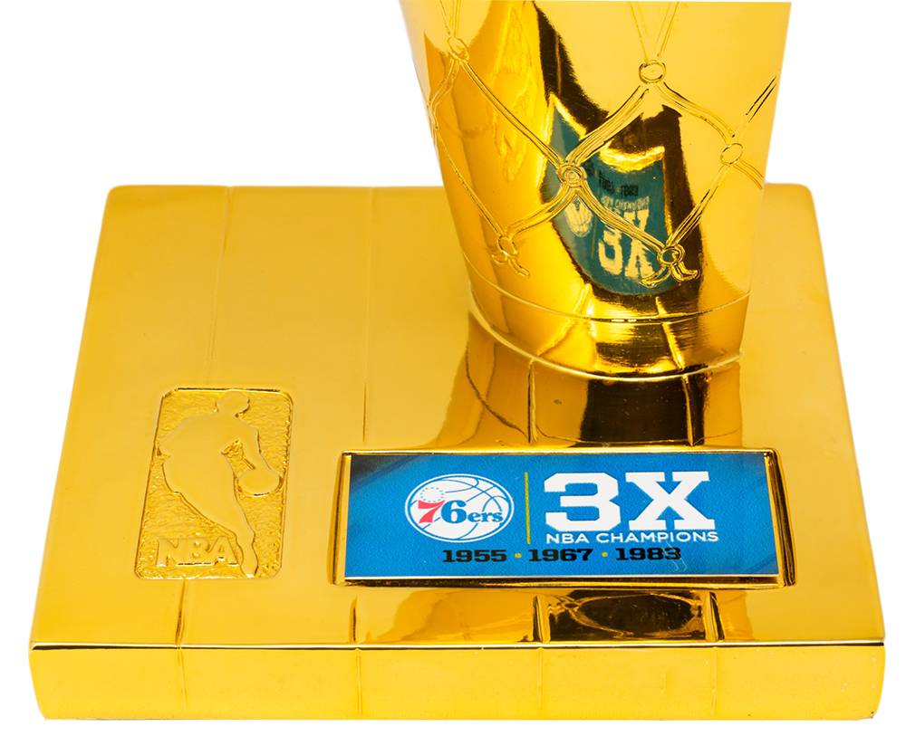 Philadelphia 76ers gold 3x NBA championship replica trophy. This trophy measures approximately 12" in size and comes with a sublimated plate attached to the base. Please note, this trophy is not signed.