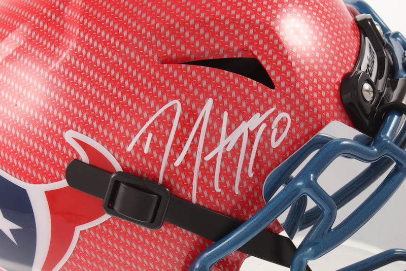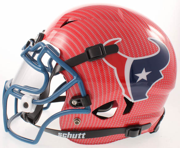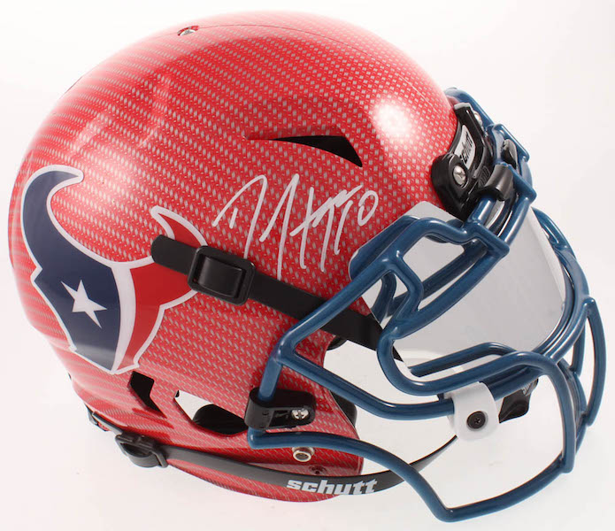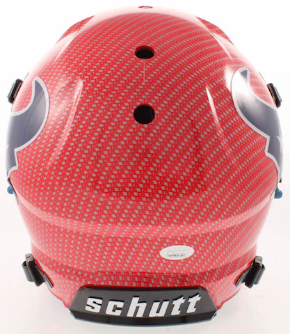 Schutt Houston Texans Youth full-size authentic on-field hydro dipped Vengeance helmet. Includes the visor shown. Has been hand-signed in white paint pen by DeAndre Hopkins.