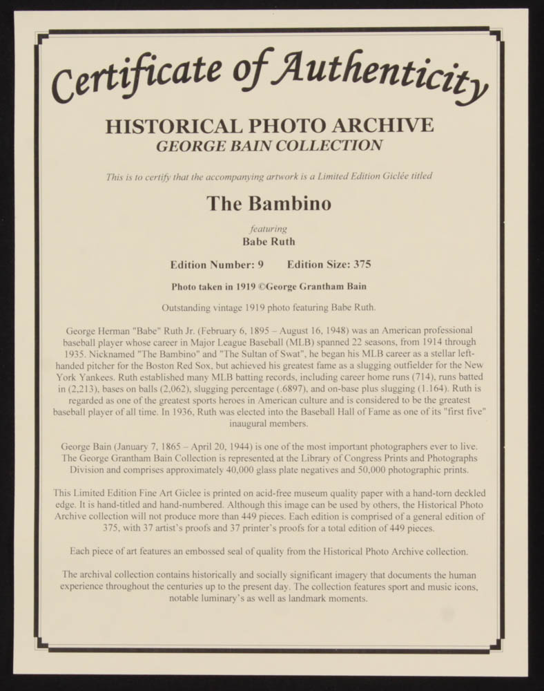 Historical Photo Archive - Babe Ruth "The Bambino" Limited Edition 16.5x22 Fine Art Giclee on Paper #9/375 (PA LOA)
