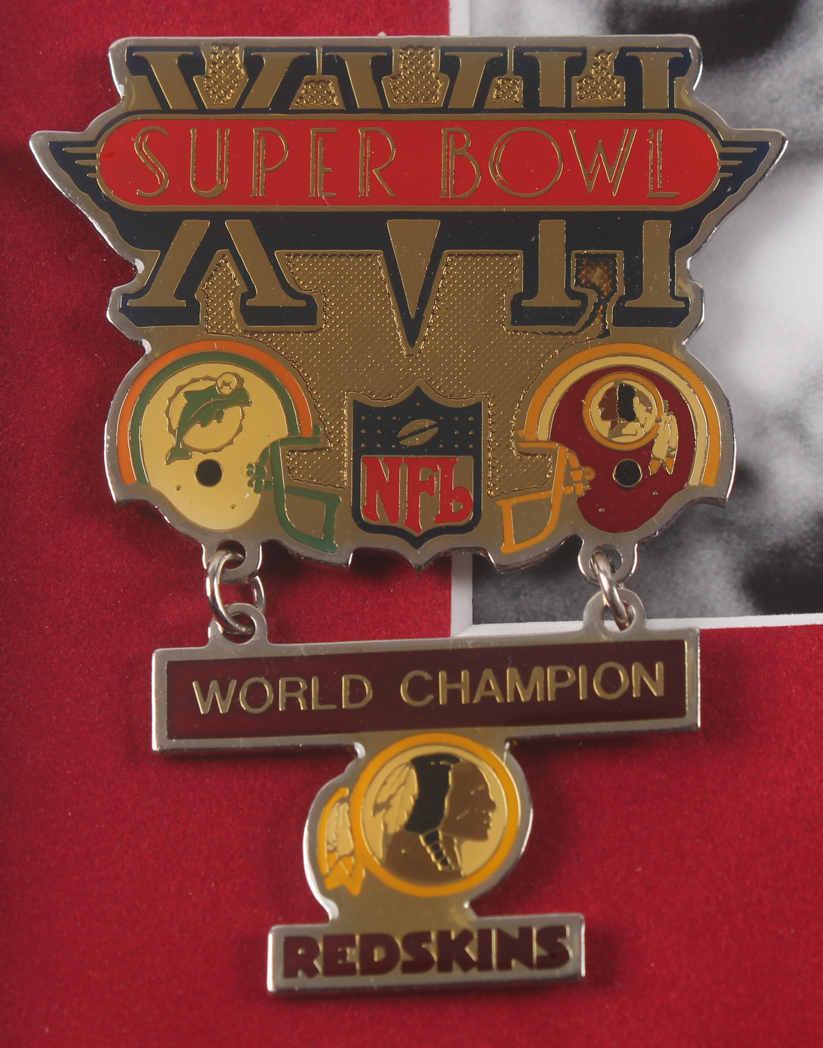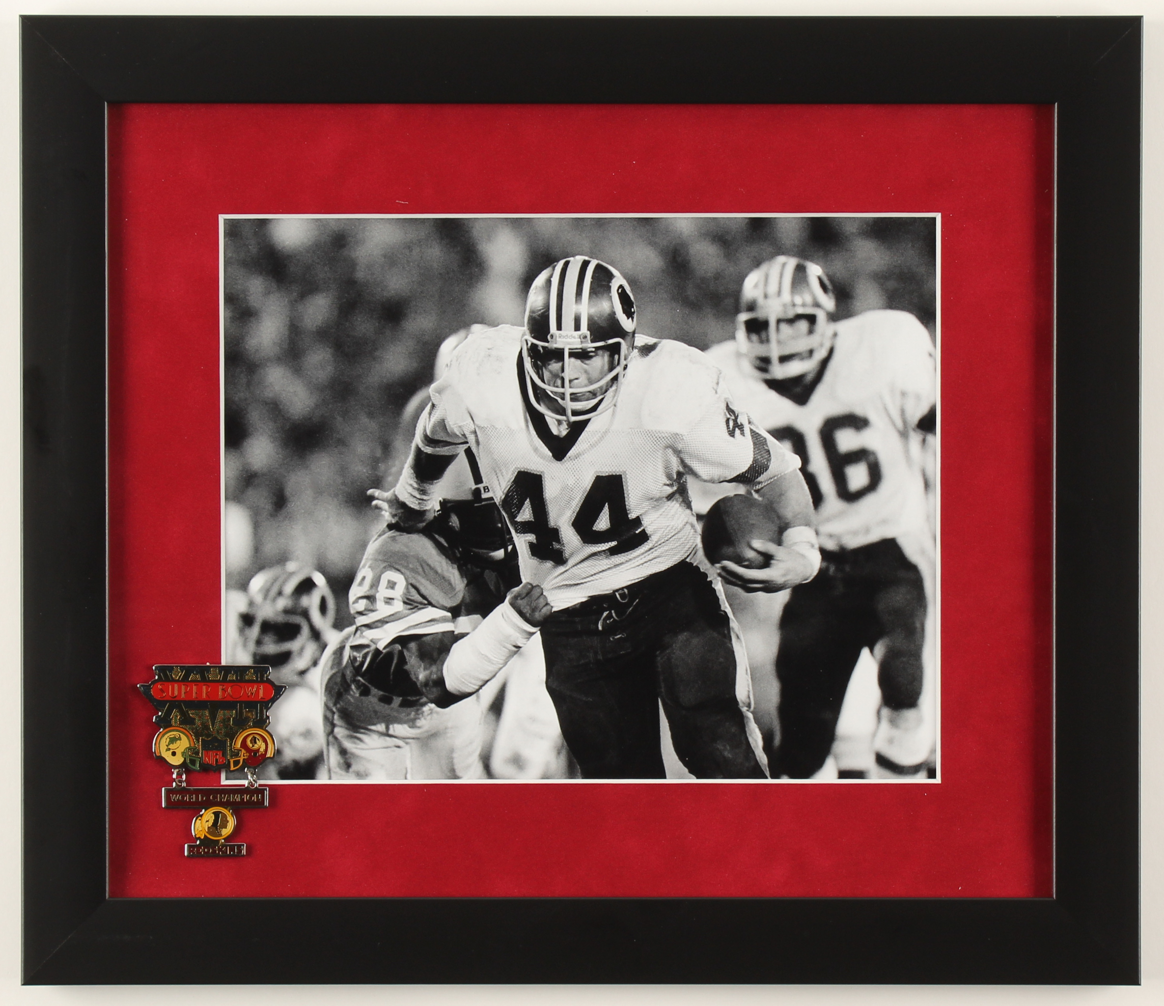 Custom frame measures 13" x 15" in size and features a photo of John Riggins (Washington Redskins, HOF). Display also features a Super Bowl XVII pin.