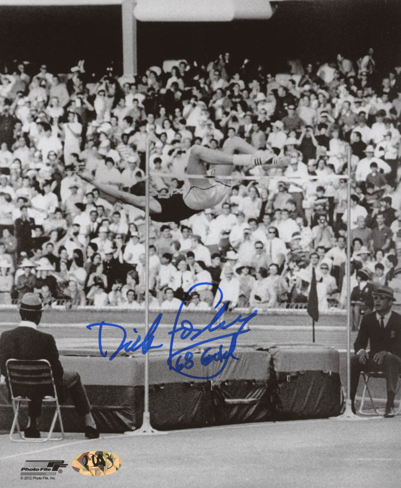 Photo measures 8" x 10" in size and has been hand-signed in blue felt-tip pen by Dick Fosbury.