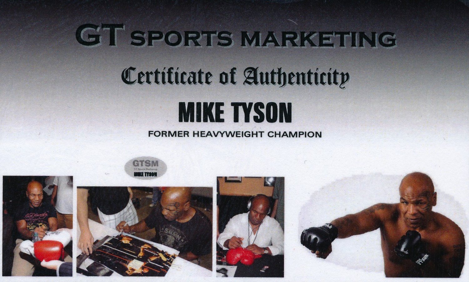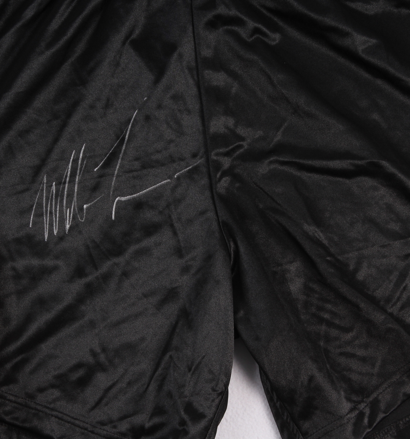 Boxing shorts, size XL. Hand-signed in silver paint pen by Mike Tyson. The autograph includes an official Mike Tyson hologram with matching COA from GT Sports for authenticity purposes.
