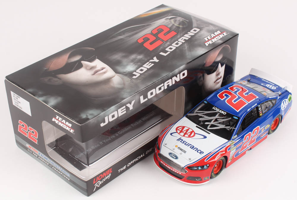 Premium die-cast car hand-signed on the windshield in silver paint pen by Joey Logano. The car is limited edition to just 637 produced and includes the original packaging.