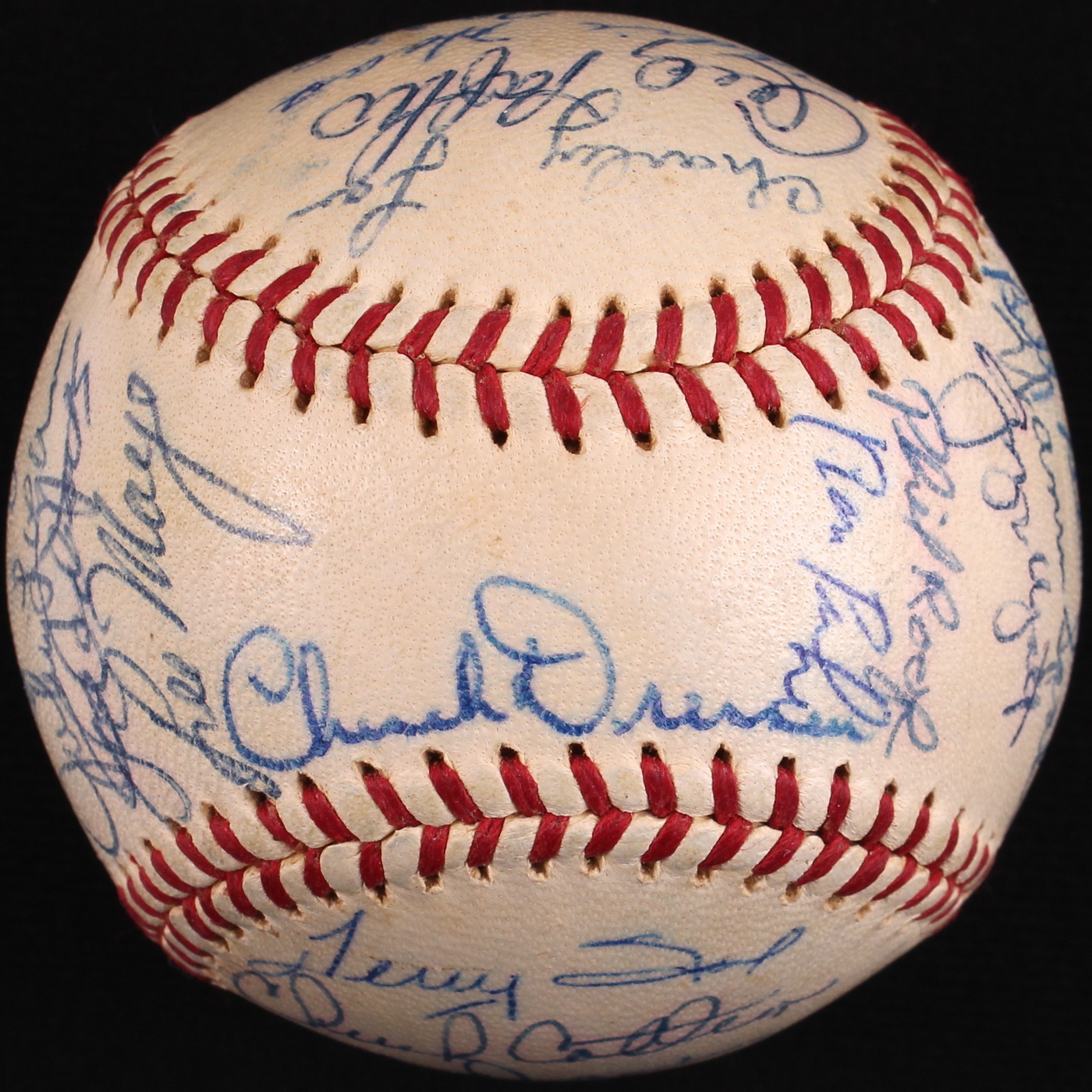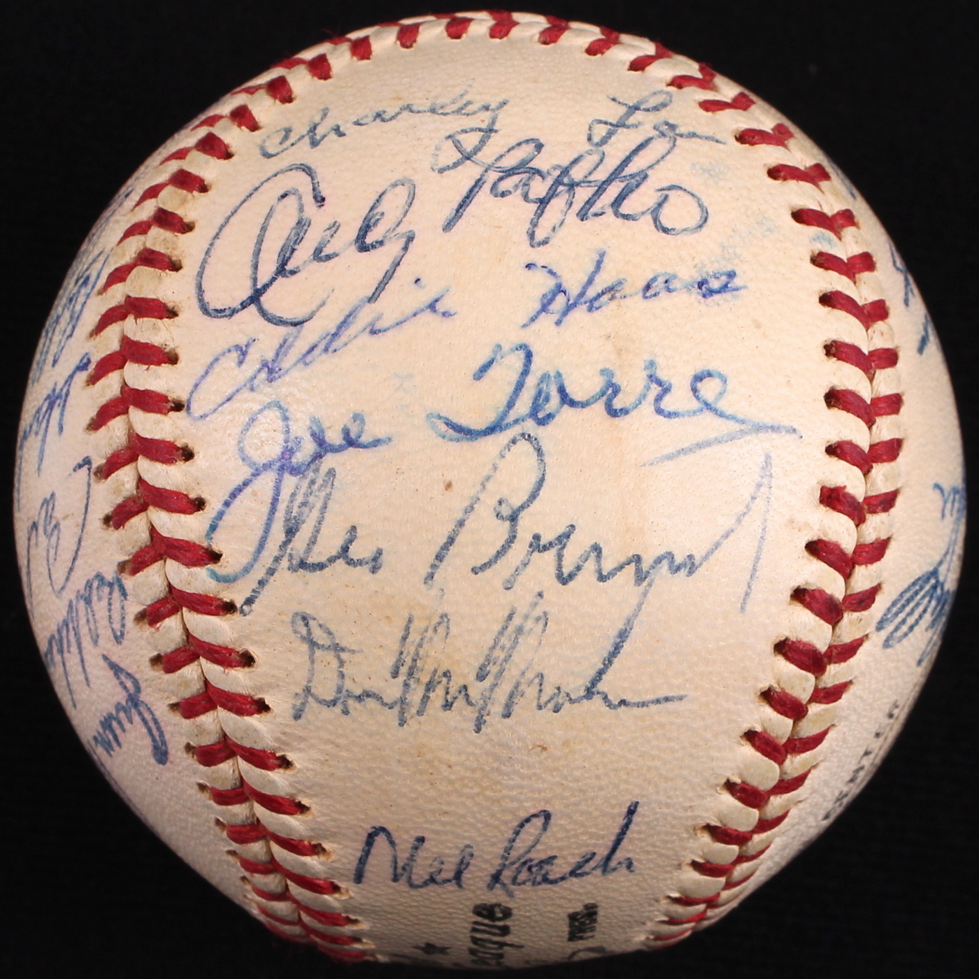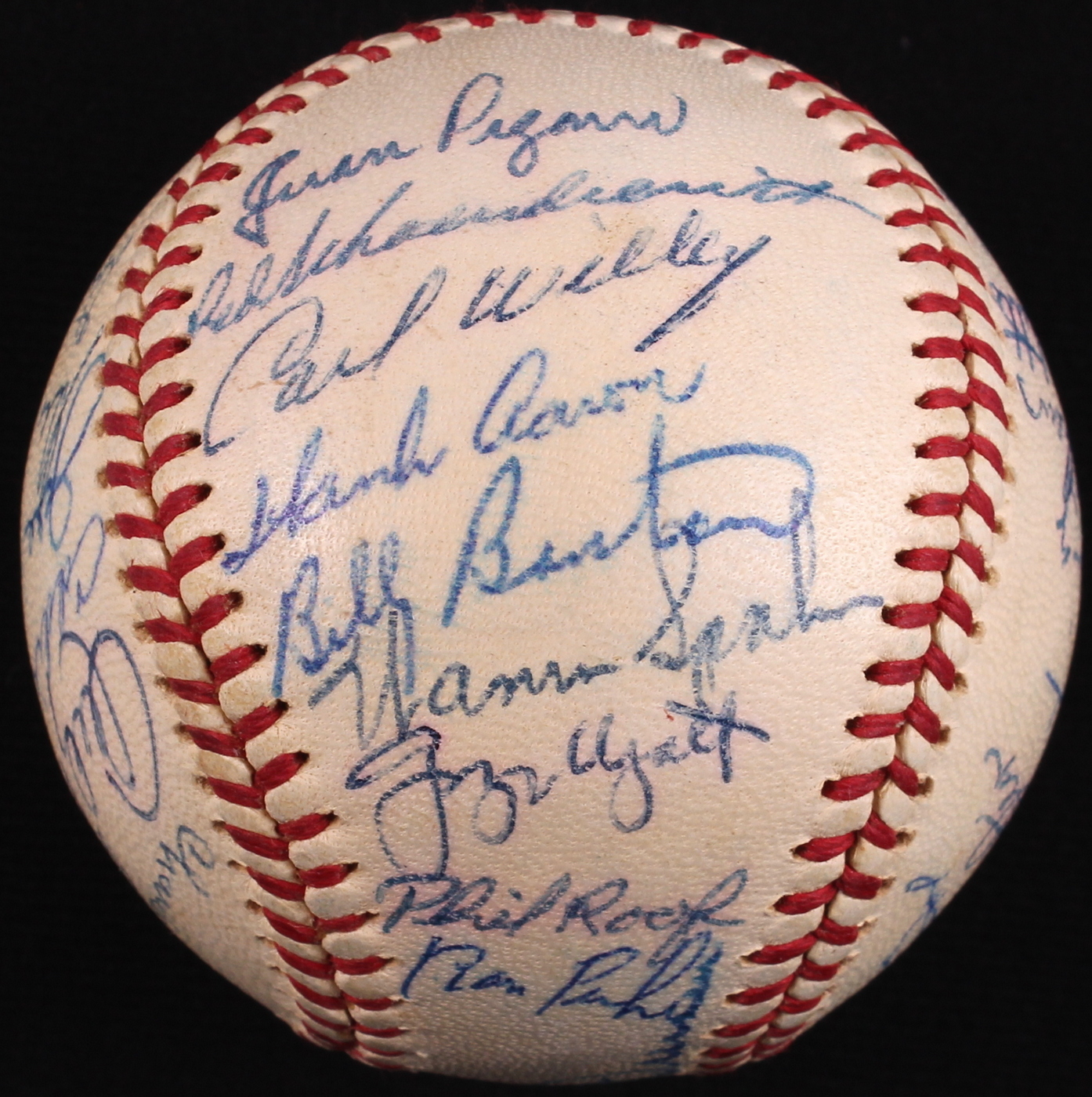Official National League baseball hand-signed in blue ink pen by 29 members of the 1960 Milwaukee Braves. Signatures include Hank Aaron (HOF), Red Schoendienst (HOF), Warren Spahn (HOF), Eddie Mathews (HOF), Lee Maye, Mel Roach, Andy Pafko, Joe Torre and others. The autographs include a James Spence Authentication (JSA) Auction House LOA for authenticity purposes.