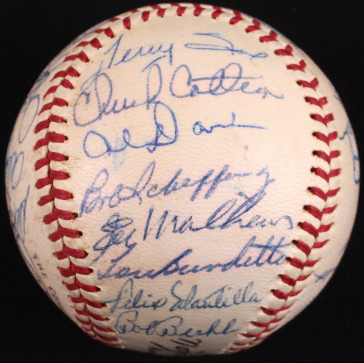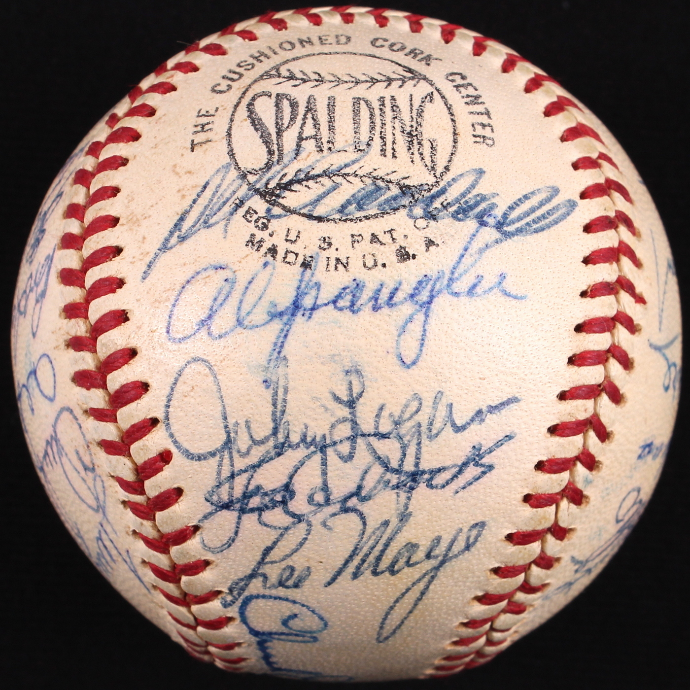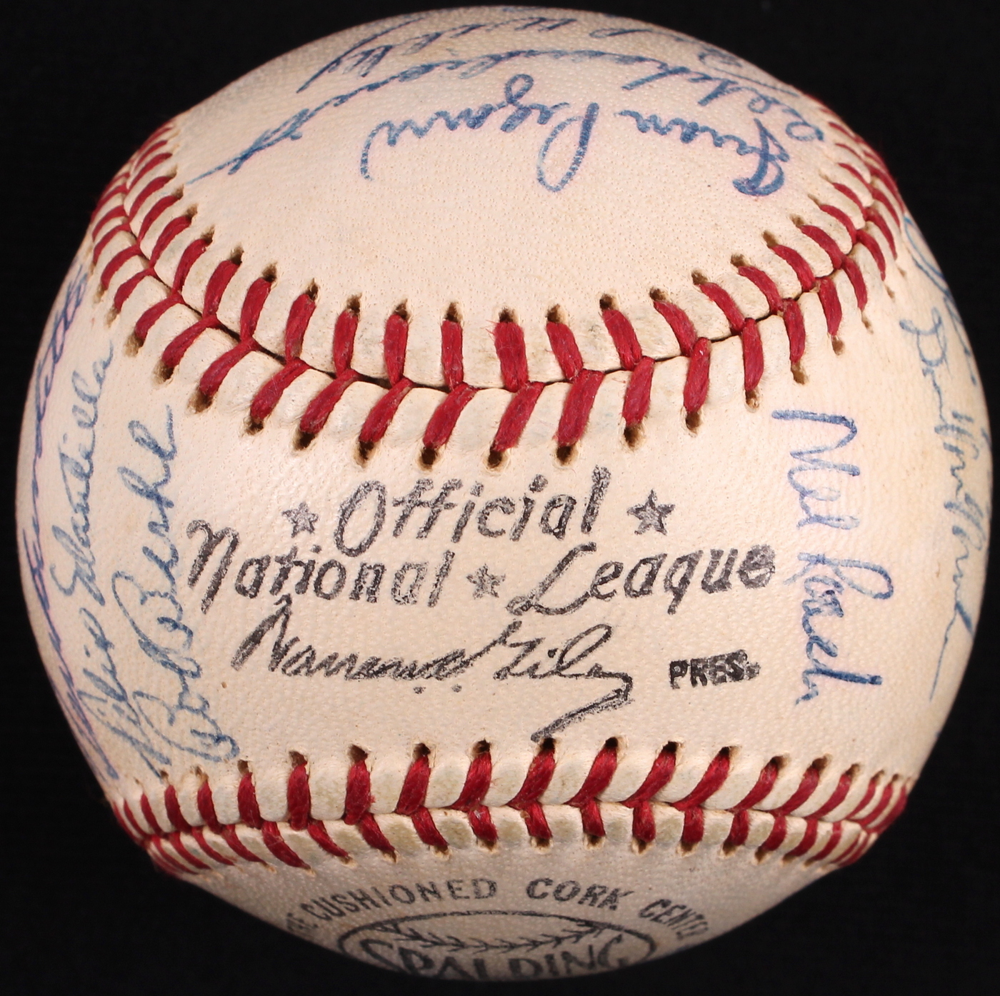 Official National League baseball hand-signed in blue ink pen by 29 members of the 1960 Milwaukee Braves. Signatures include Hank Aaron (HOF), Red Schoendienst (HOF), Warren Spahn (HOF), Eddie Mathews (HOF), Lee Maye, Mel Roach, Andy Pafko, Joe Torre and others. The autographs include a James Spence Authentication (JSA) Auction House LOA for authenticity purposes.