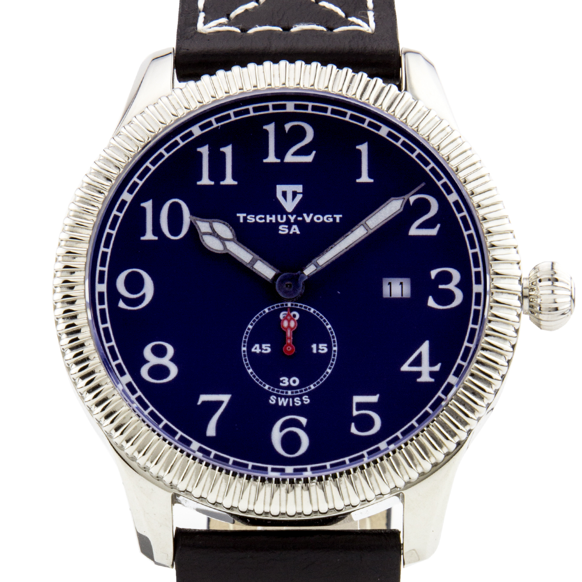 The Tschuy-Vogt A24 Cavalier Men's Watch features a black leather strap, silver case, and blue dial. Please see photos for details.