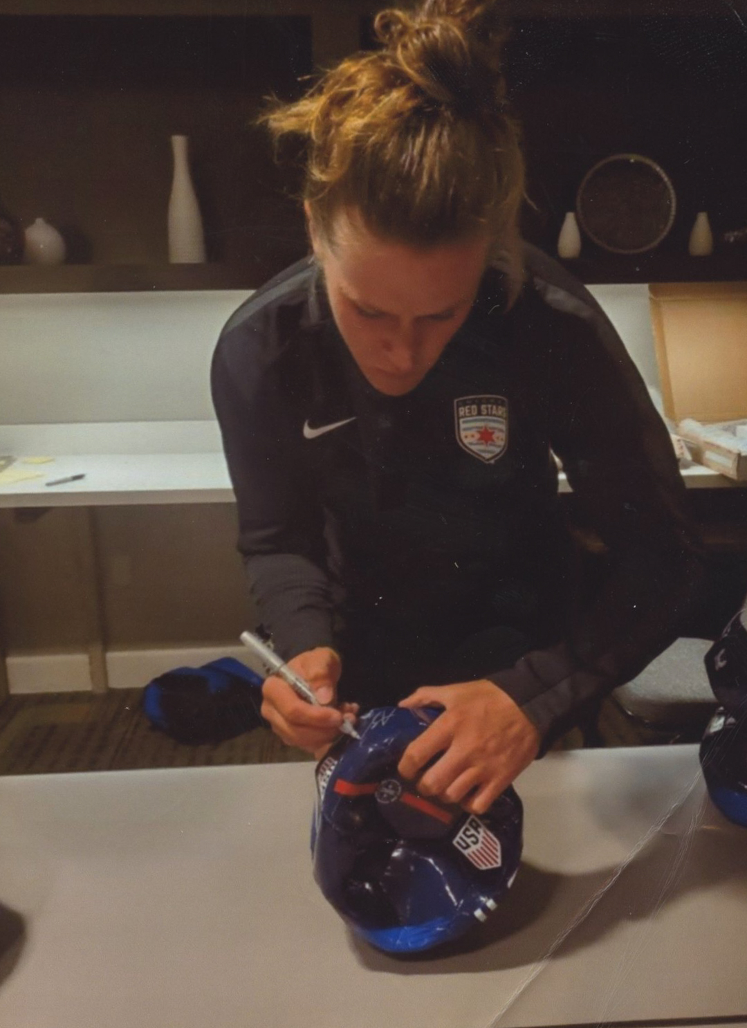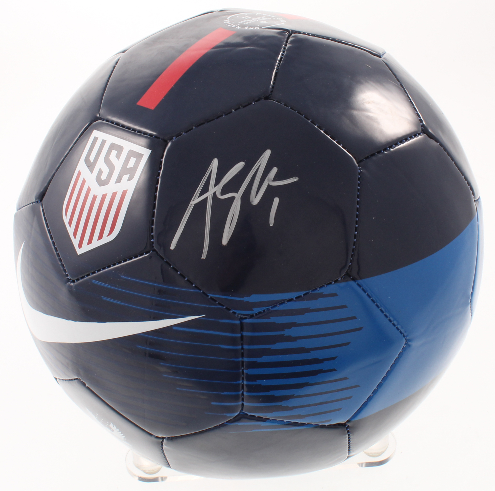Nike Team USA logo soccer ball has been hand-signed in silver paint pen by Alyssa Naeher.