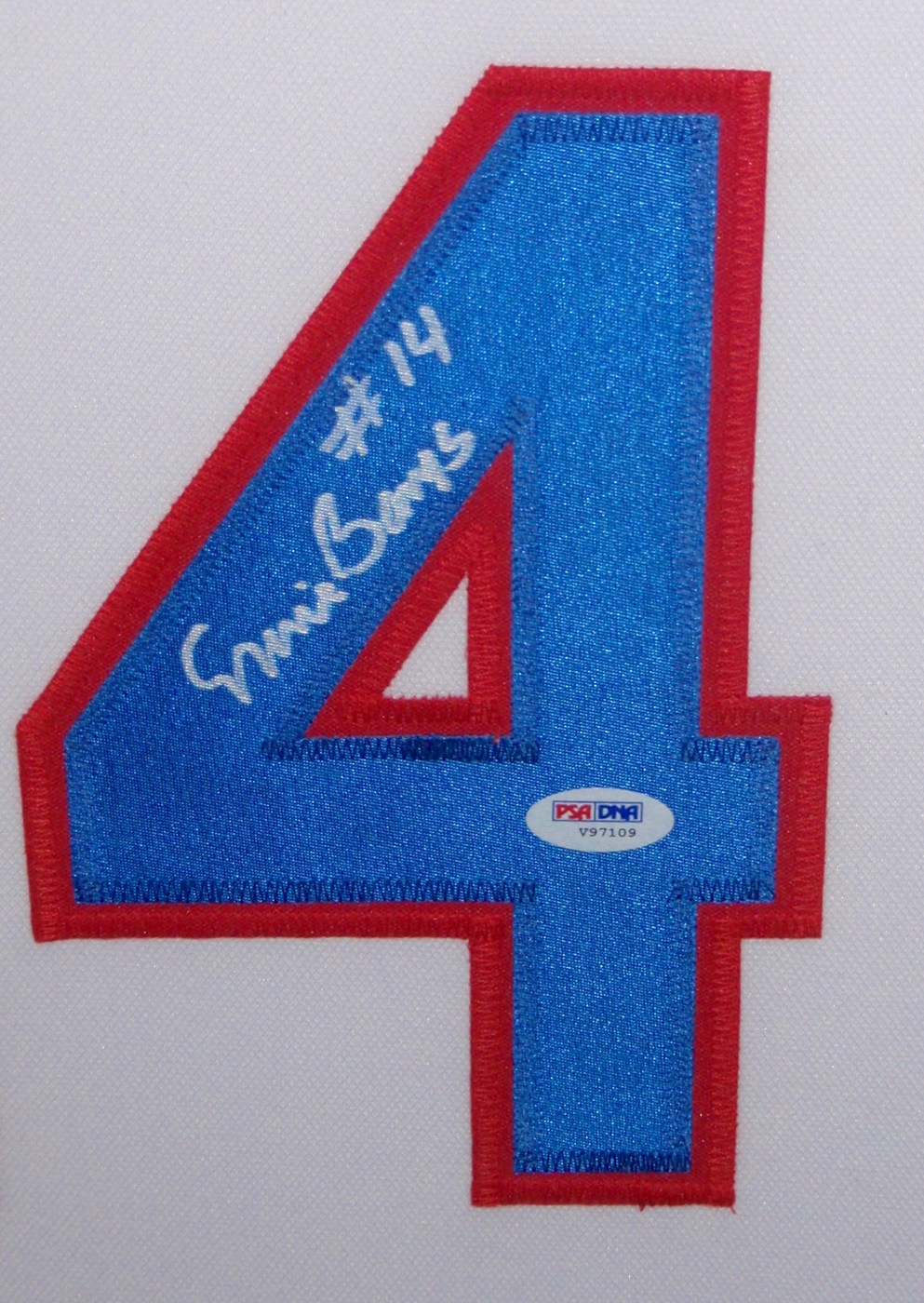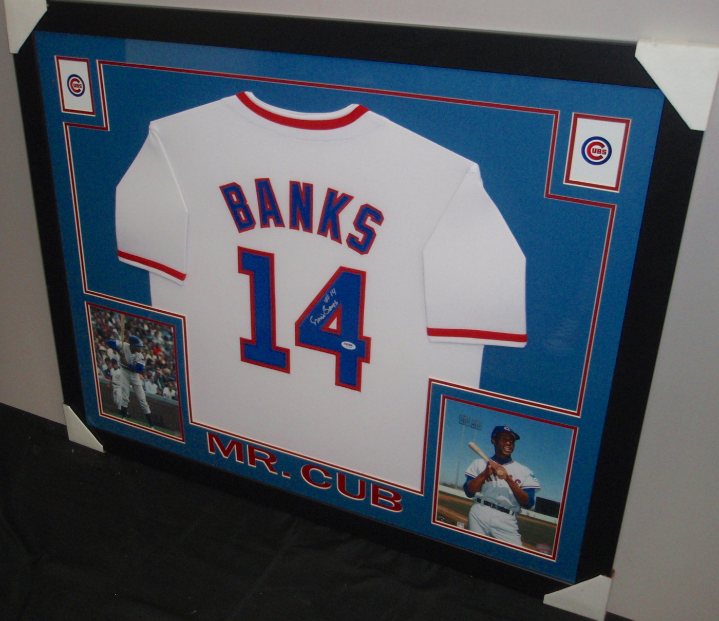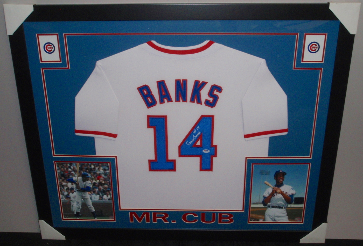 Custom frame measures approximately 35" x 43" in size and features a jersey which has been hand-signed in silver paint pen by Ernie Banks (Cubs, HOF). The autograph includes an official PSA/DNA hologram and matching COA for authenticity purposes.