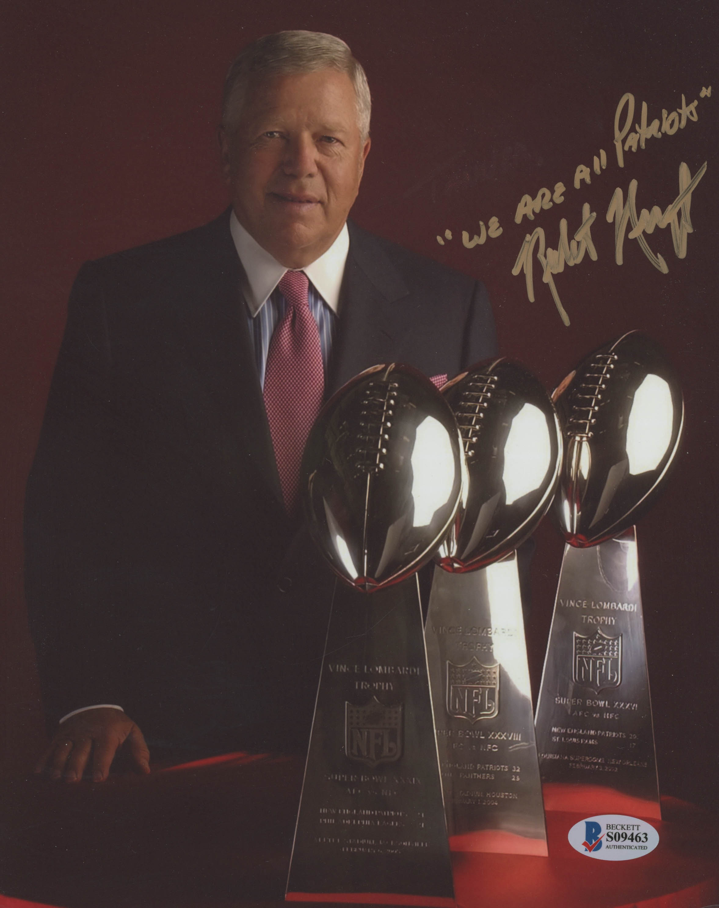Photo measures 8" x 10" in size and has been hand-signed in gold paint pen by Robert Kraft. (New England Patriots) Please note, a personalization has been removed.