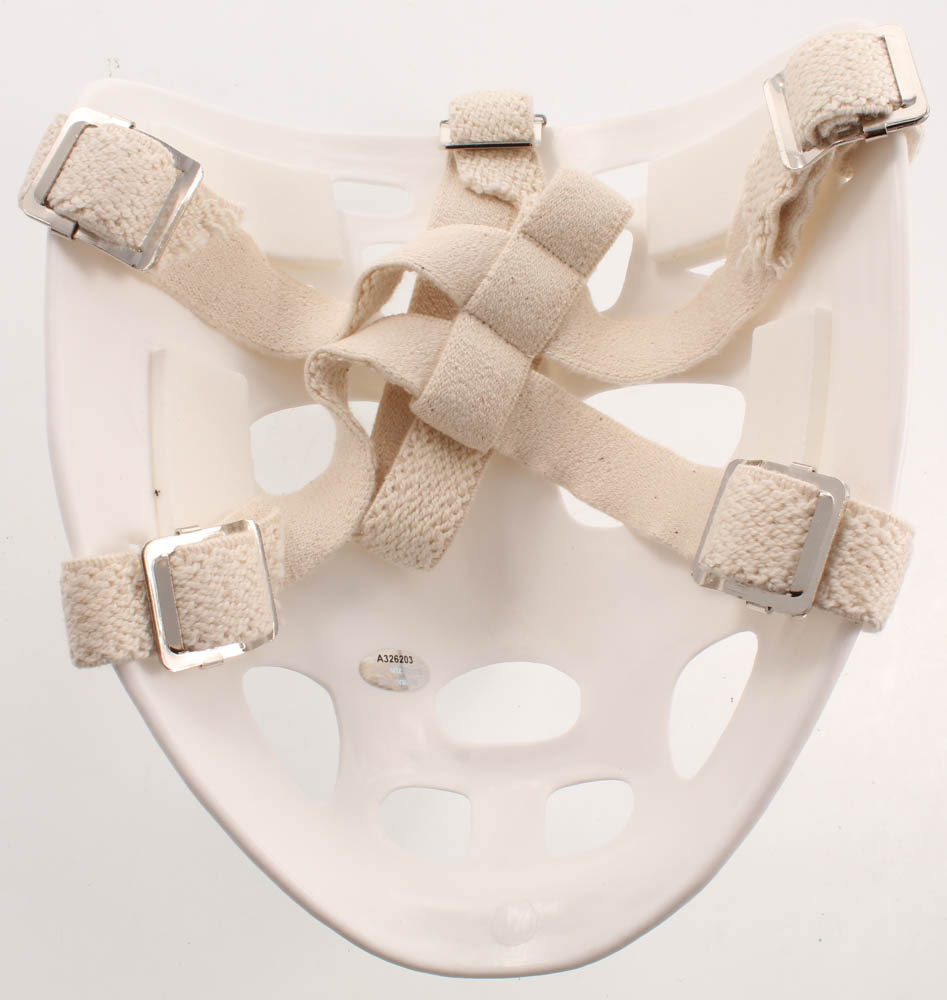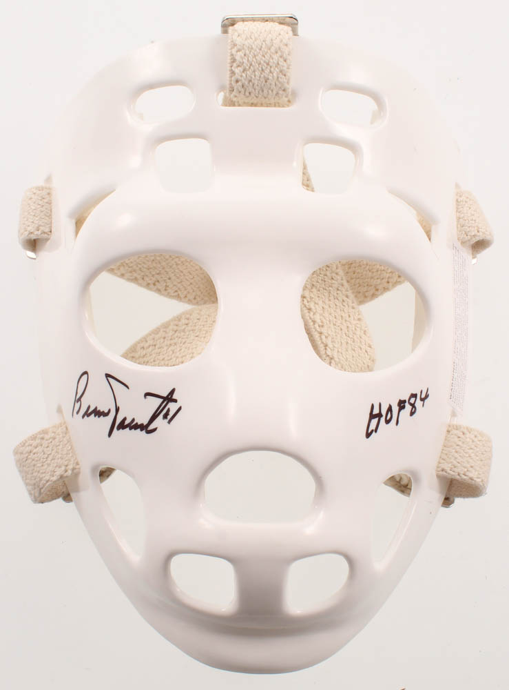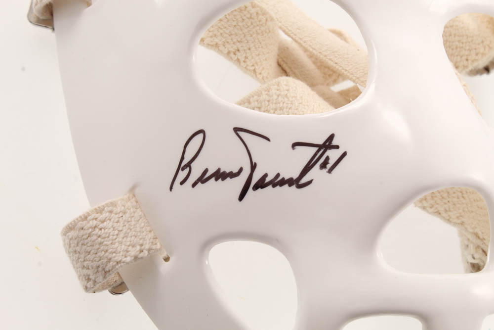 Full-size throwback replica hockey mask has been hand-signed and inscribed in black felt-tip pen by Bernie Parent (Philadelphia Flyers, HOF).