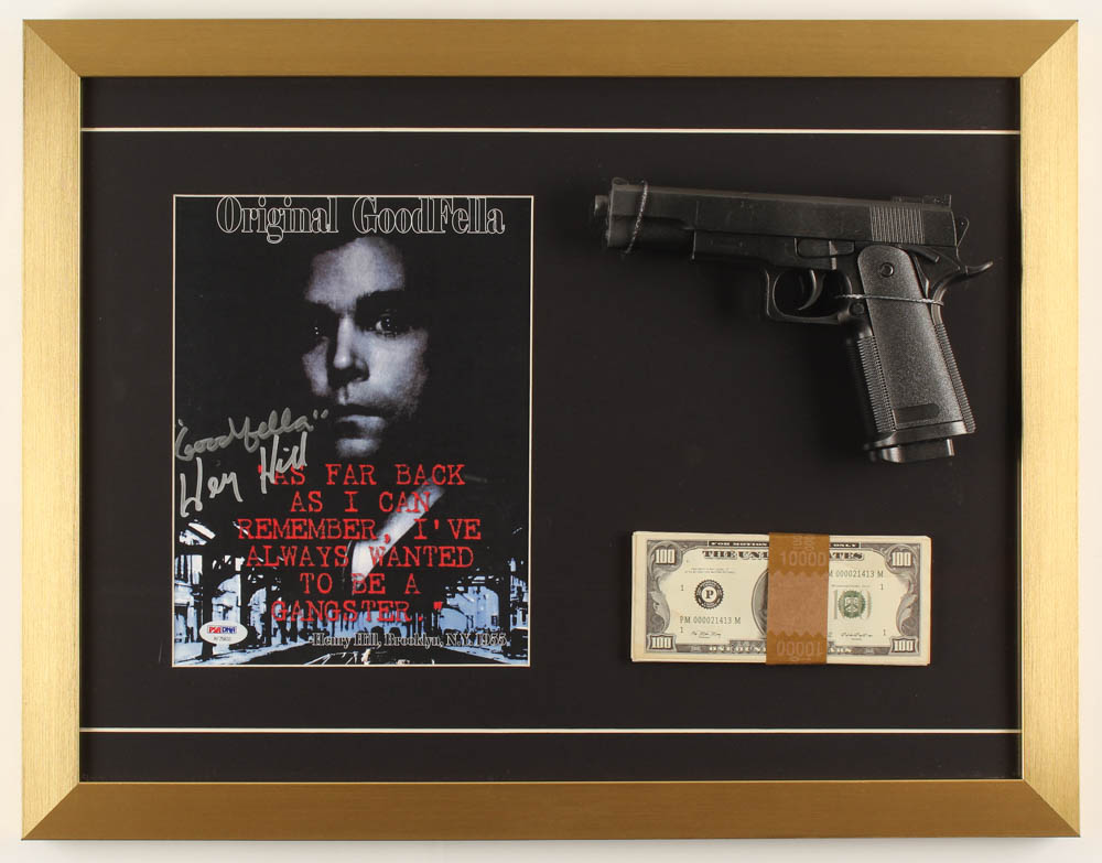 Henry Hill Signed "Goodfellas" 17x22 Custom Framed Print Display Inscribed "Goodfella" with Replica Gun & Prop Money (PSA COA)