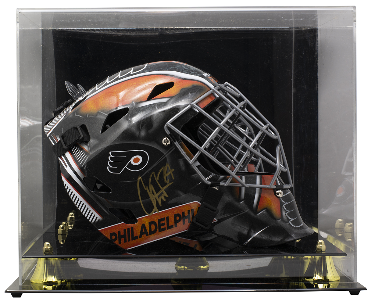 Philadelphia Flyers Full-Size Replica Goalie Mask. Hand-signed in gold paint pen by Carter Hart. The high-quality acrylic display case is included in this auction.
