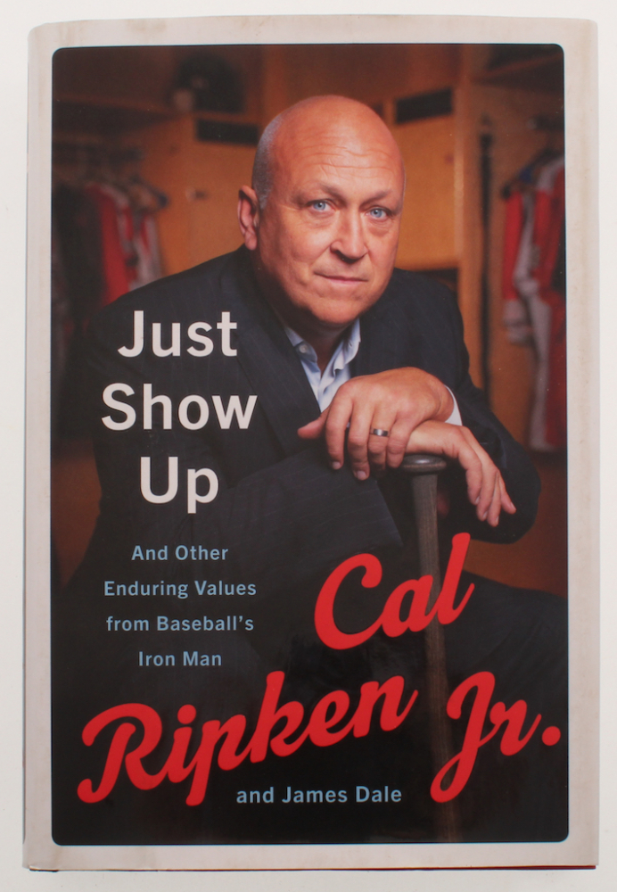 "Just Show Up: And Other Enduring Values from Baseball's Iron Man" hard-cover book. Hand-signed in blue felt-tip pen by Cal Ripken Jr. (Baltimore Orioles, HOF).