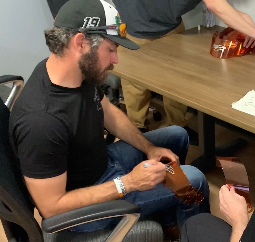 Full-size replica NASCAR helmet hand-signed on the visor in silver paint pen by Martin Truex Jr.