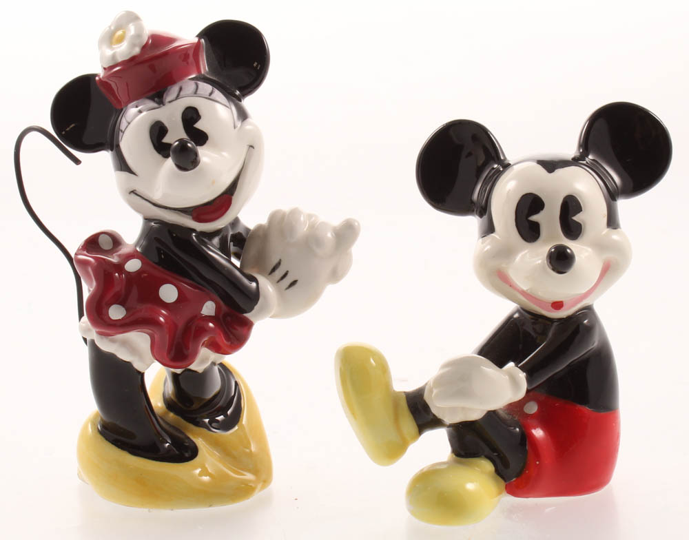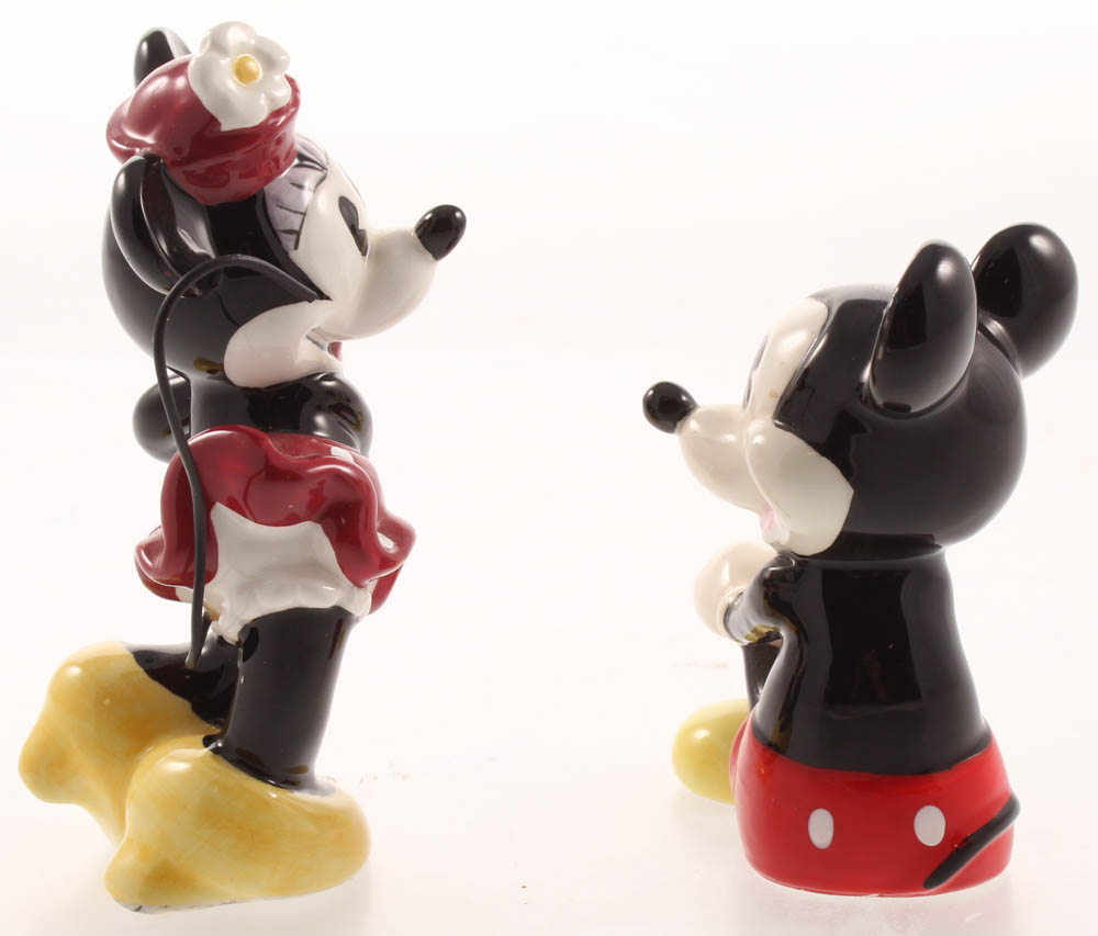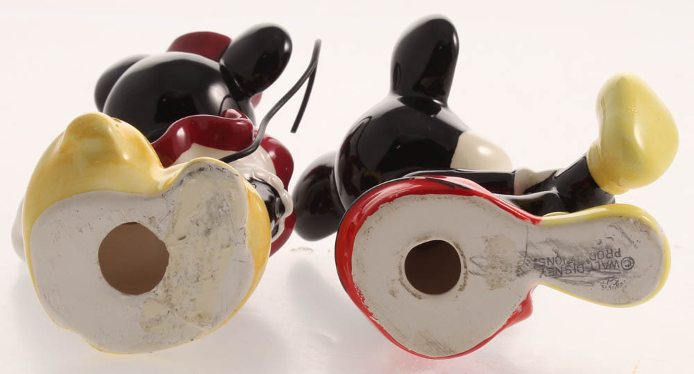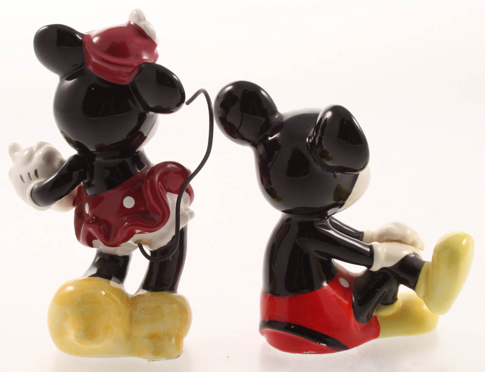 Vintage 1970's ceramic Mickey and Minnie Mouse figurines measure approximately 4" in size. Figurines include display case as shown.