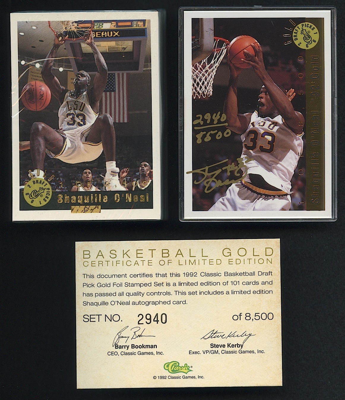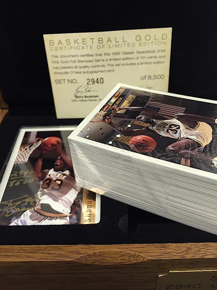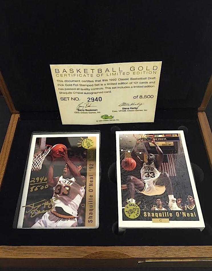Set is limited edition #5262/8500. Comes still factory sealed in the original wooden display box. Also includes a Shaquille O'Neal hand-signed & numbered card. The set includes a matching COA from Classic.