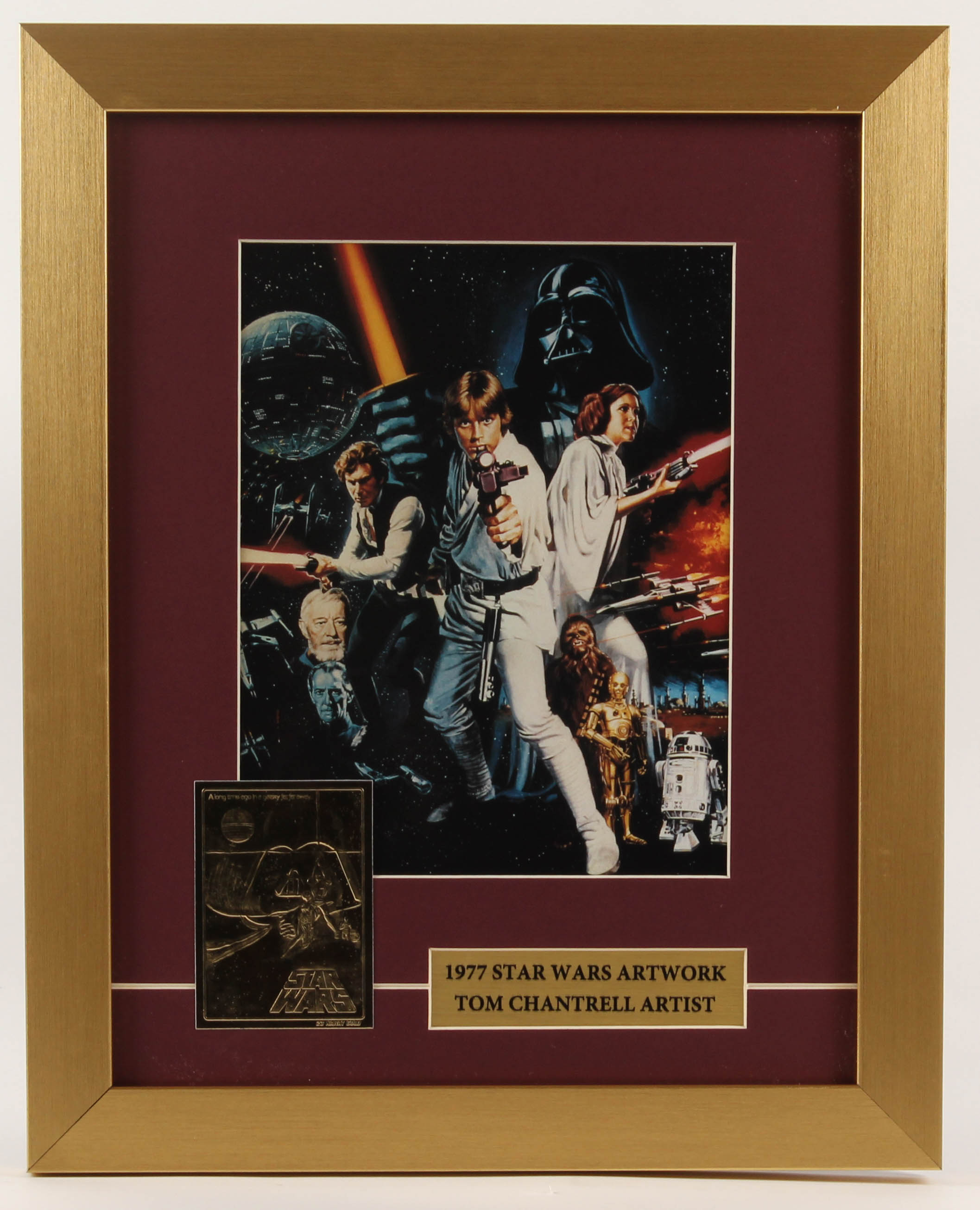 Custom frame measures 13" x 16" in size and features a Tom Chantrell print from the film "Star Wars Episode IV: A New Hope" (1977). Display also features a 23 KT gold card.