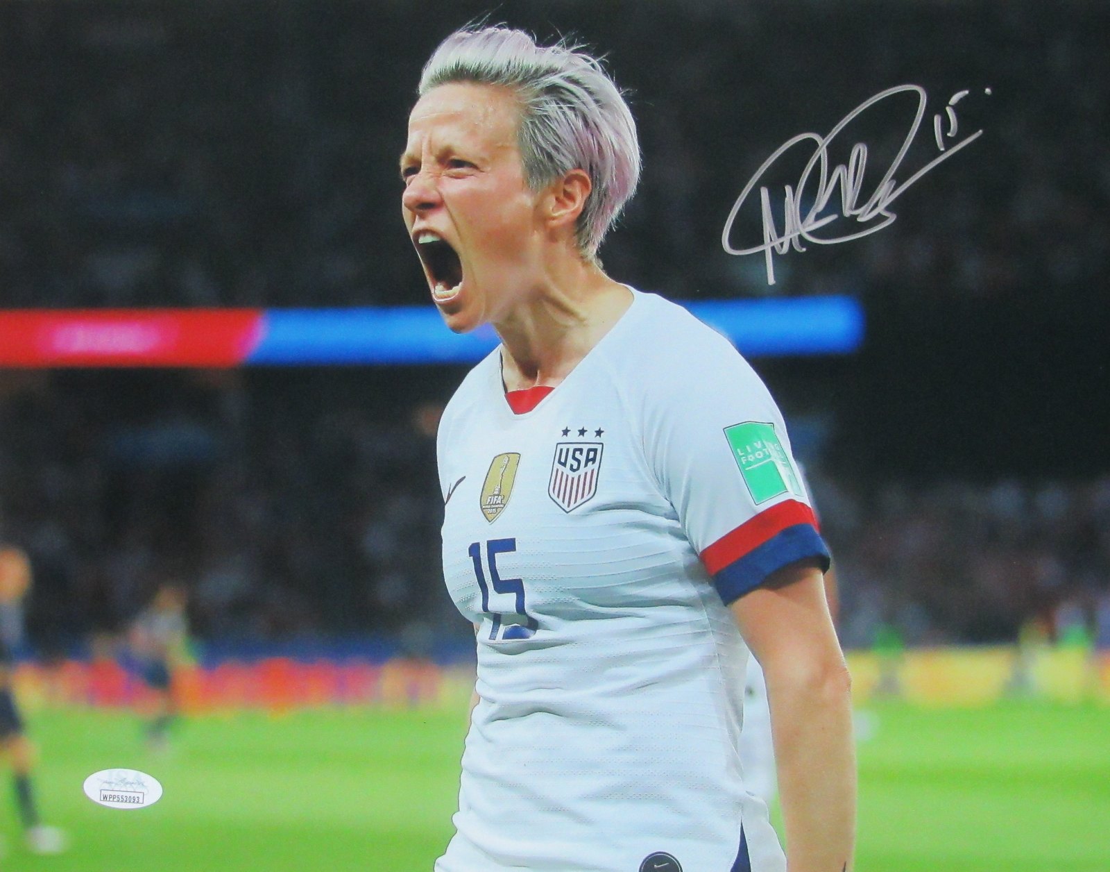 Photo measures 11" x 14" in size and has been hand-signed by Megan Rapinoe.