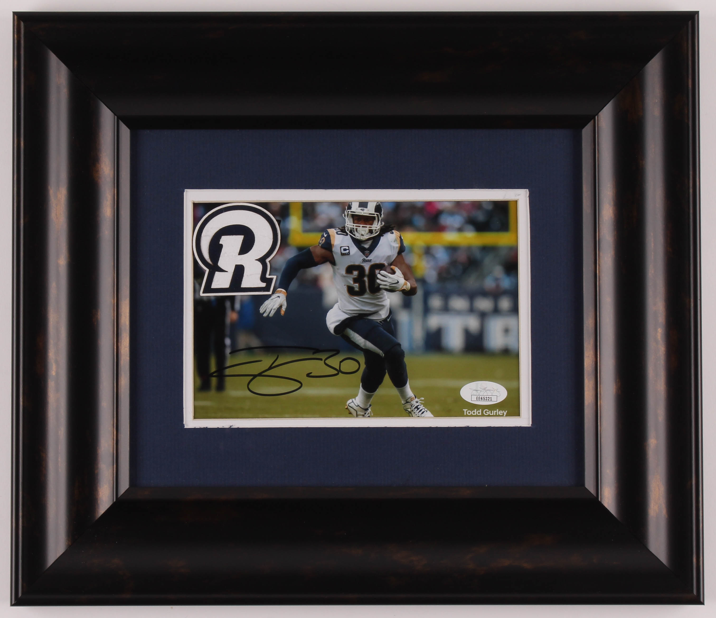 Custom frame measures approximately 12.5" x 14" in size and features a photo that has been hand signed in black felt-tip pen by Todd Gurley II (Los Angeles Rams).