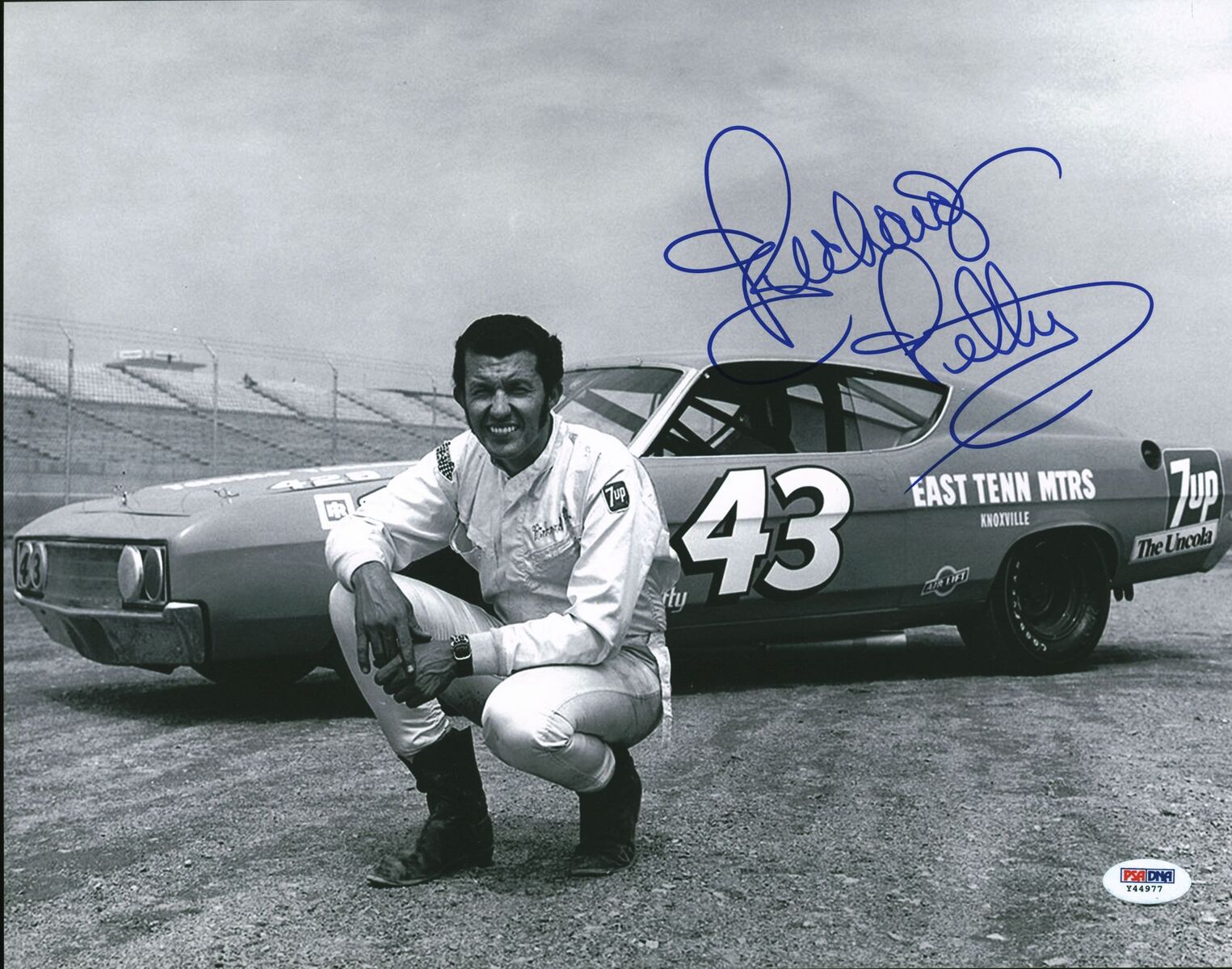 Photo measures 11" x 14" in size and has been hand-signed in blue felt-tip pen by Richard Petty.