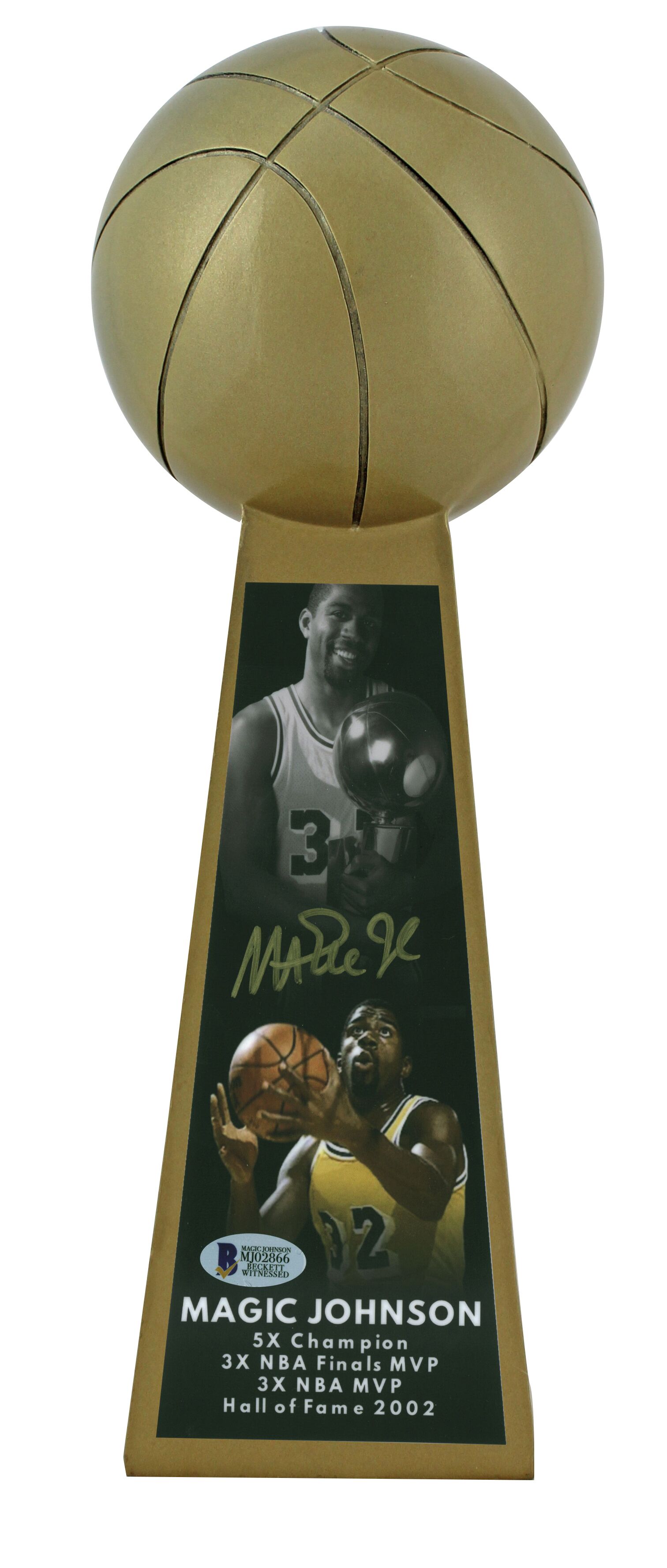 Replica championship basketball trophy measures approximately 14" in height and has been hand-signed in gold paint pen by Magic Johnson (Los Angeles Lakers, HOF).