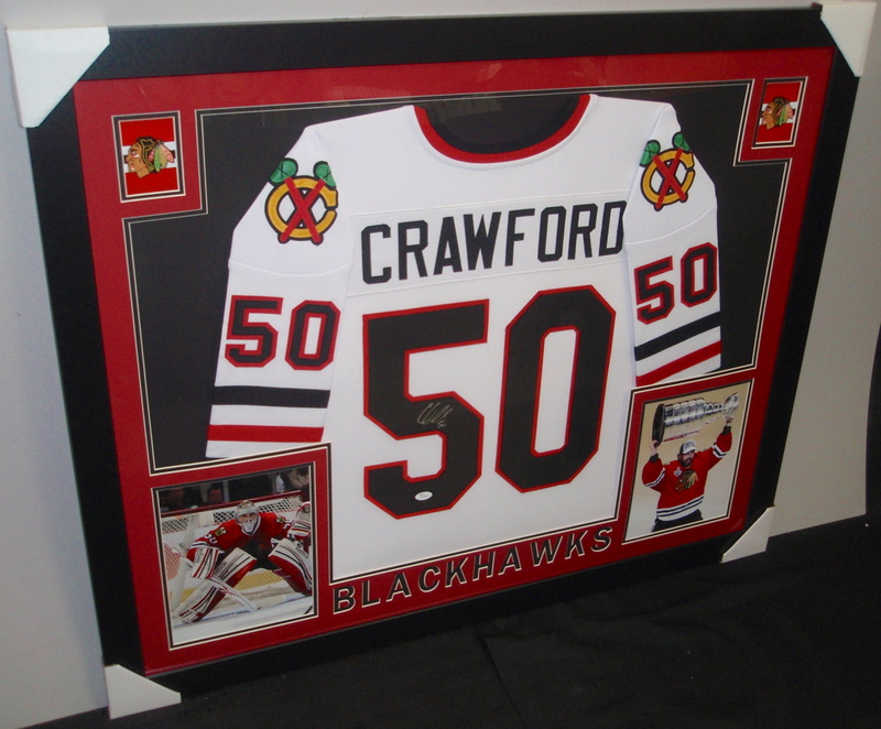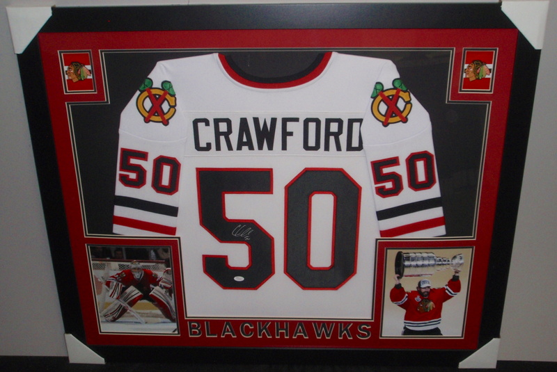 Corey Crawford Signed Blackhawks 35x43 Custom Framed Jersey (JSA COA)