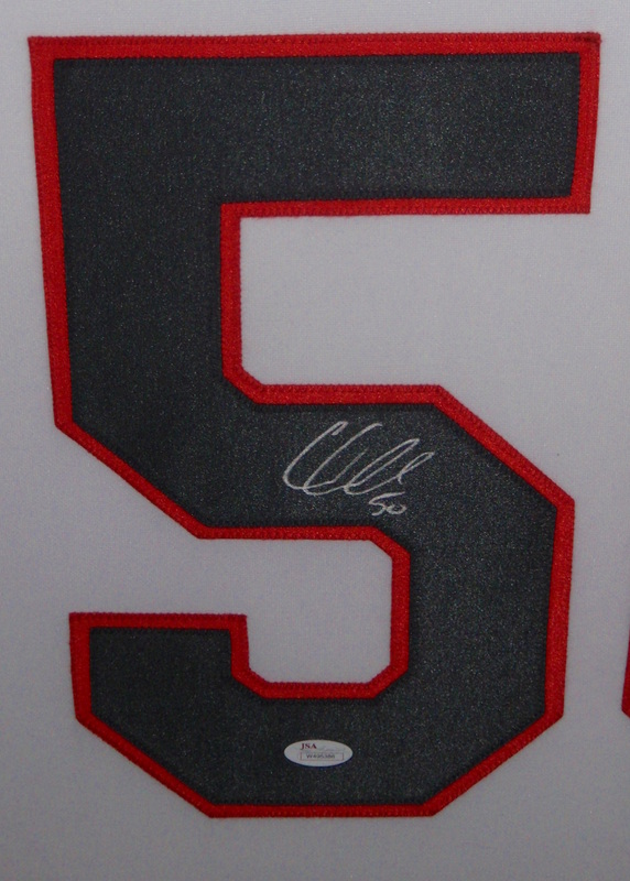 Custom frame measures approximately 35" x 43" in size and features a jersey which has been hand-signed in silver paint pen by Corey Crawford. The autograph includes an official James Spence Authentication (JSA) hologram and matching COA for authenticity purposes. The signing of this item was witnessed by JSA.
