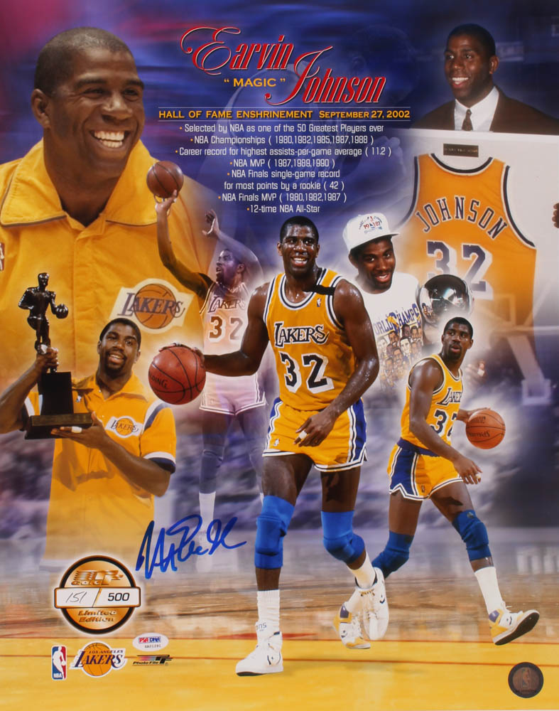 Photo measures 16" x 20" in size and has been hand-signed in blue paint pen by Magic Johnson (Los Angeles Lakers, HOF). The photo is hand-numbered limited edition #151/500.