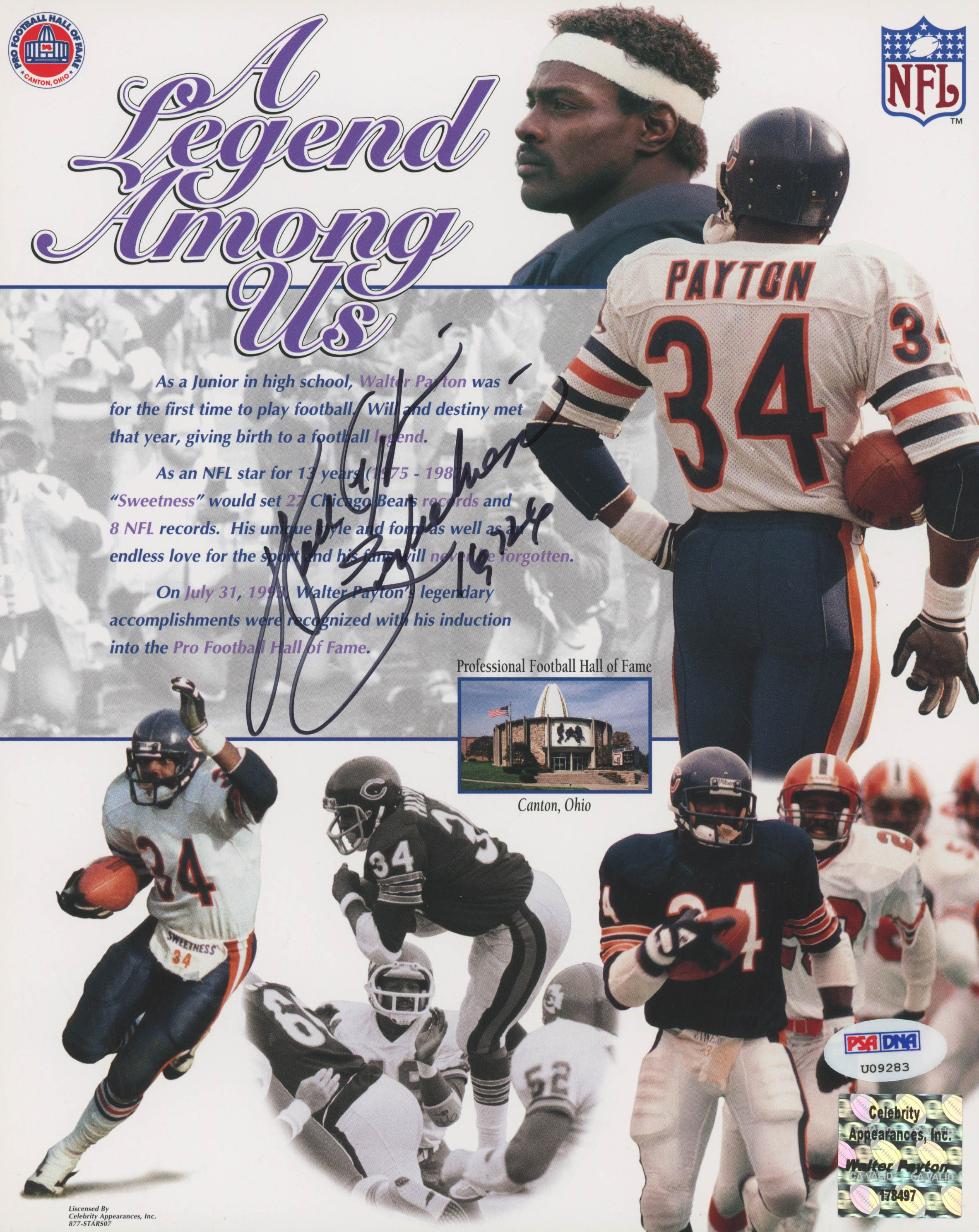 Photo measures 8" x 10" in size and has been hand-signed in black felt-tip pen by Walter Payton (D. 1999, Chicago Bears, HOF).