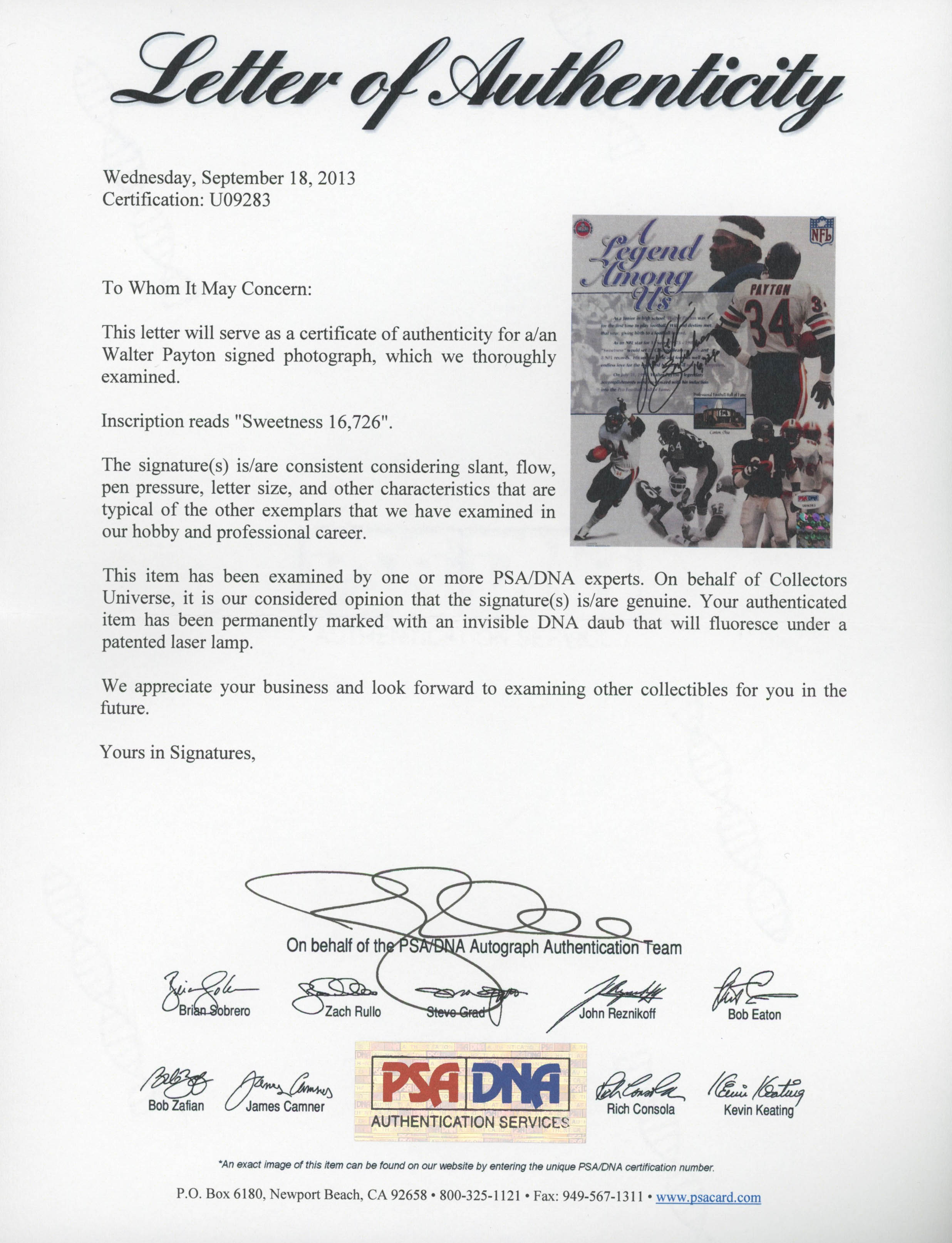 Walter Payton Signed Bears 8x10 Photo Inscribed "Sweetness" & "16,726" (PSA LOA)