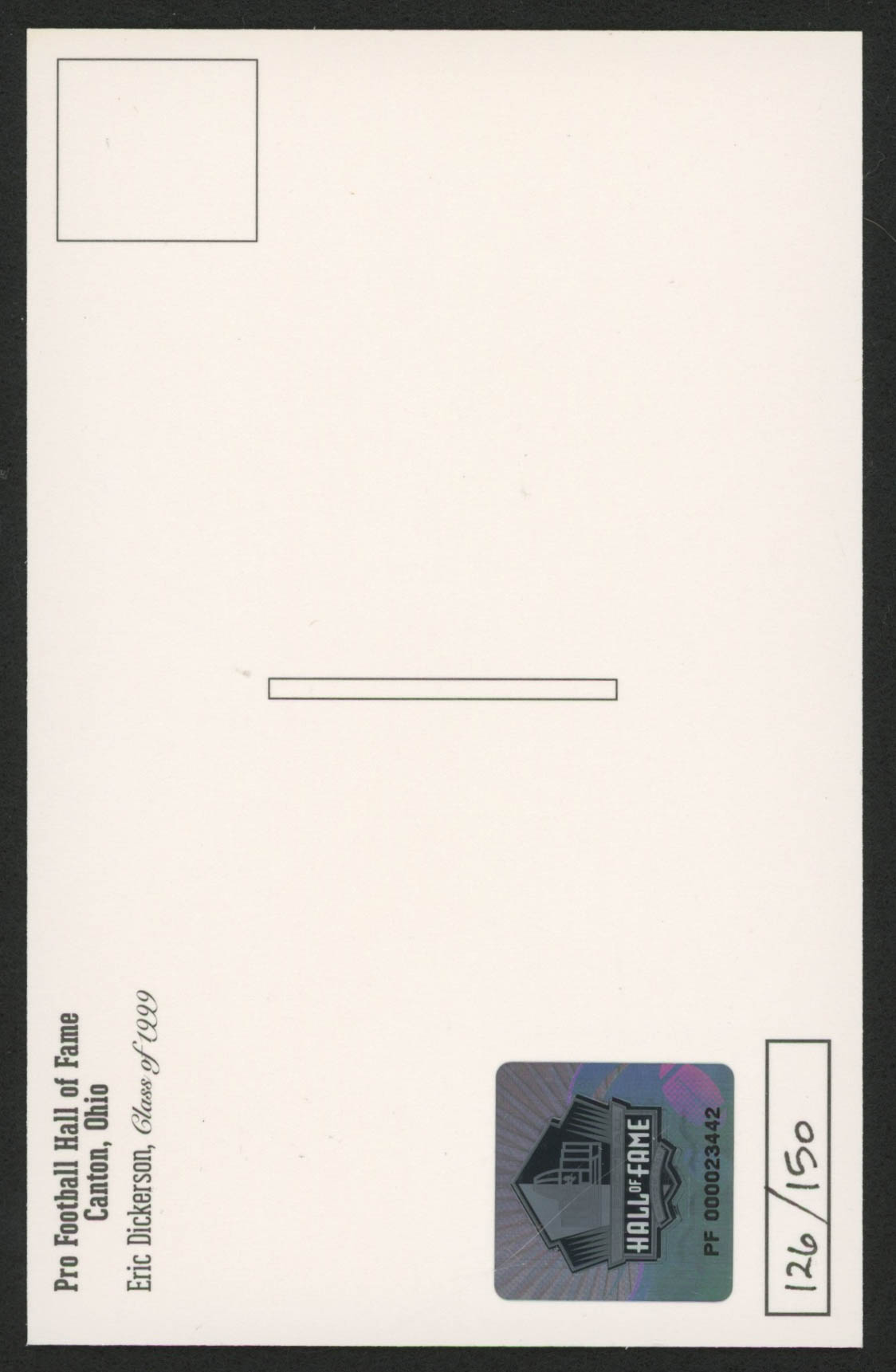 Bronze Bust Football Hall of Fame Postcard measures 3.5" x 5.5" in size and has been hand-signed in black felt-tip pen by Eric Dickerson (Los Angeles Rams, HOF). The postcard is limited edition and has been hand-numbered #126/150.