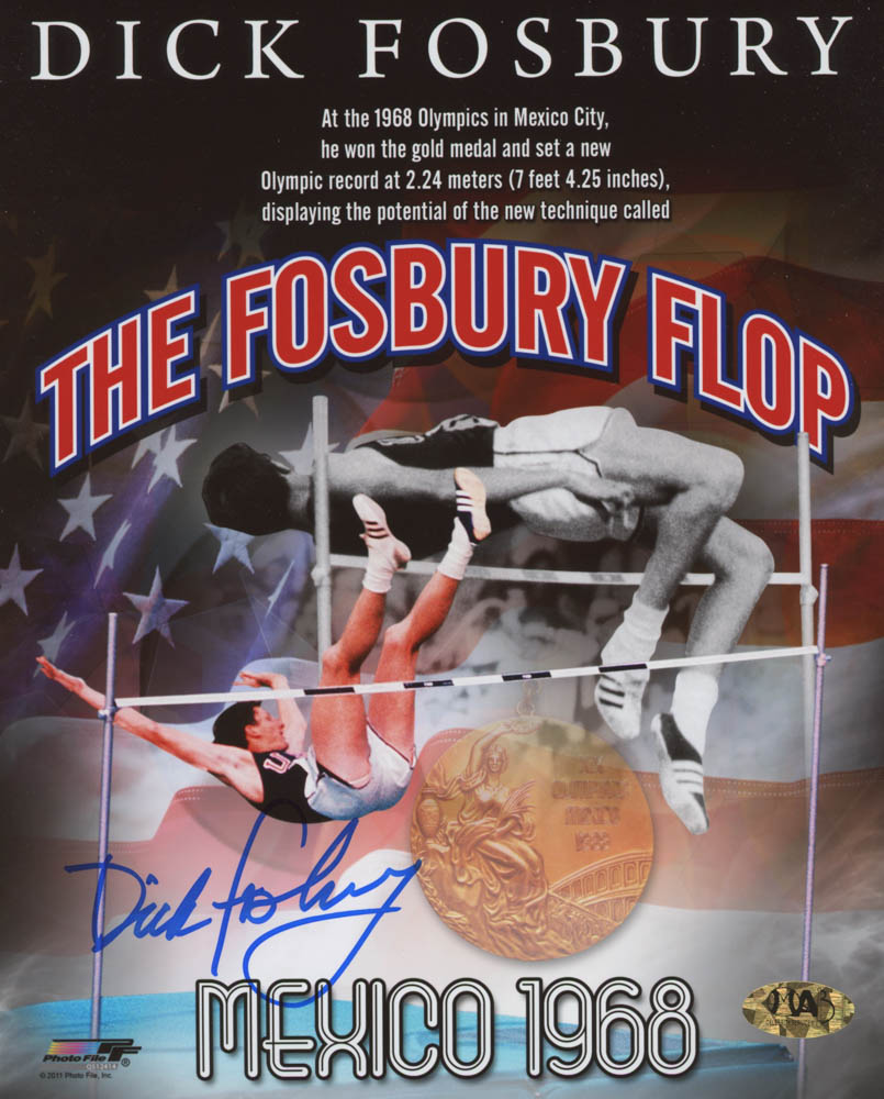 Photo measures 8" x 10" in size and has been hand-signed in blue felt-tip pen by Dick Fosbury.