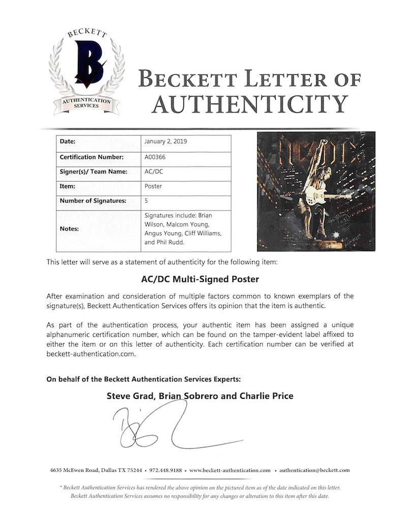 AC/DC 30x40 Poster Band-Signed by (5) with Brian Johnson, Malcolm Young, Angus Young, Cliff Williams & Phil Rudd Inscribed "ACDC" (Beckett LOA)Phil Rudd