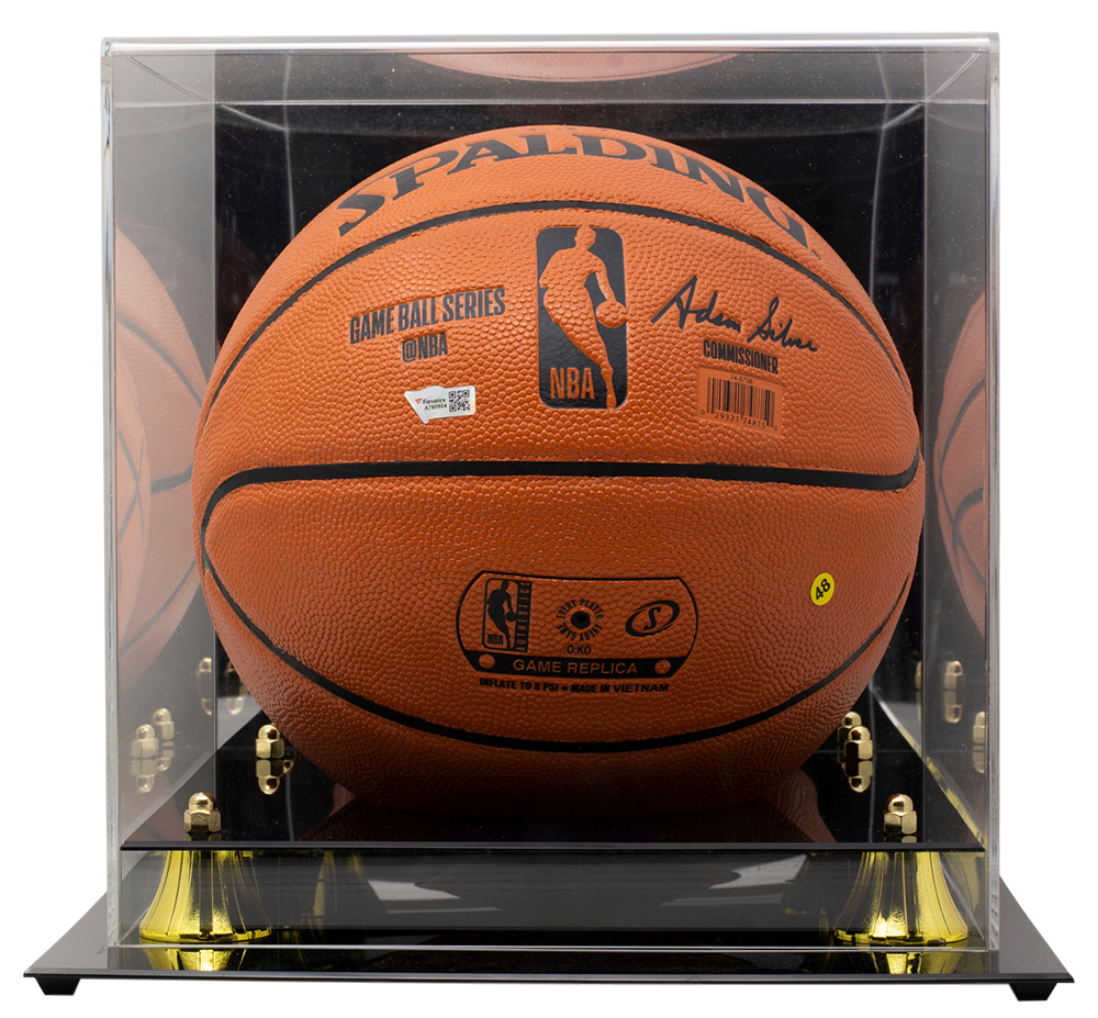 Spalding NBA Game Ball Series Basketball. Hand-signed in silver paint pen by Zion Williamson (New Orleans Pelicans). Also included with this lot is a high-quality acrylic display case.