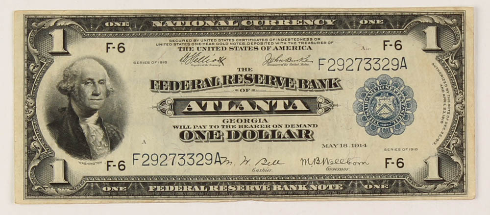 1918 $1 One-Dollar U.S. National Currency Large-Size Bank Note - The Federal Reserve Bank of Atlanta, Georgia