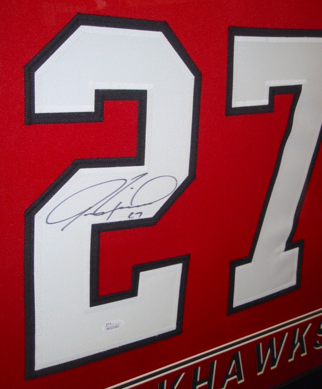 Custom frame measures approximately 35" x 43" in size and features a jersey which has been hand-signed in black felt-tip pen by Jeremy Roenick. The autograph includes an official James Spence Authentication (JSA) hologram for authenticity purposes. The signing of this item was witnessed by JSA.