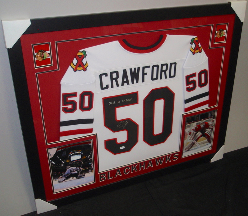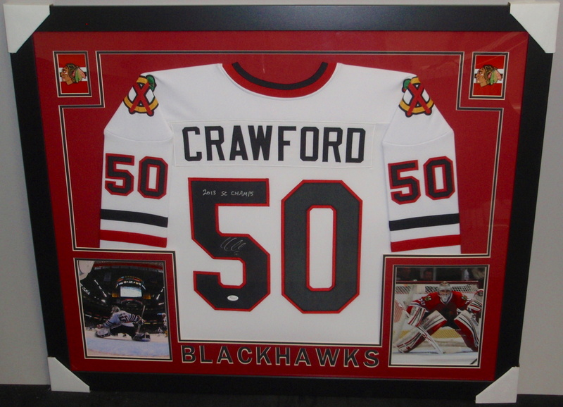 Corey Crawford Signed Blackhawks 35x43 Custom Framed Jersey (JSA)