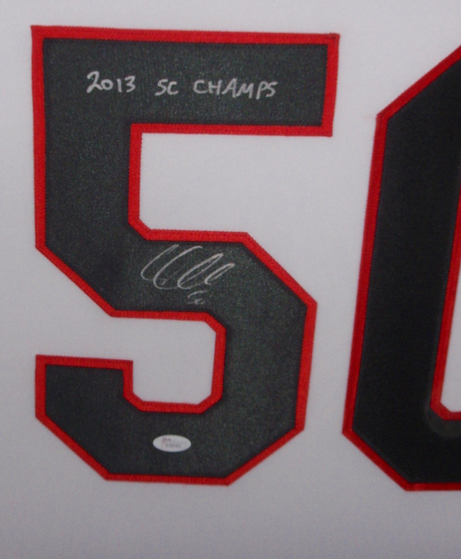 Custom frame measures approximately 35" x 43" in size and features a jersey which has been hand-signed in silver paint pen by Corey Crawford. The autograph includes an official James Spence Authentication (JSA) hologram for authenticity purposes. The signing of this item was witnessed by JSA.