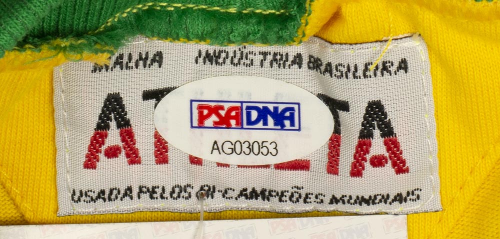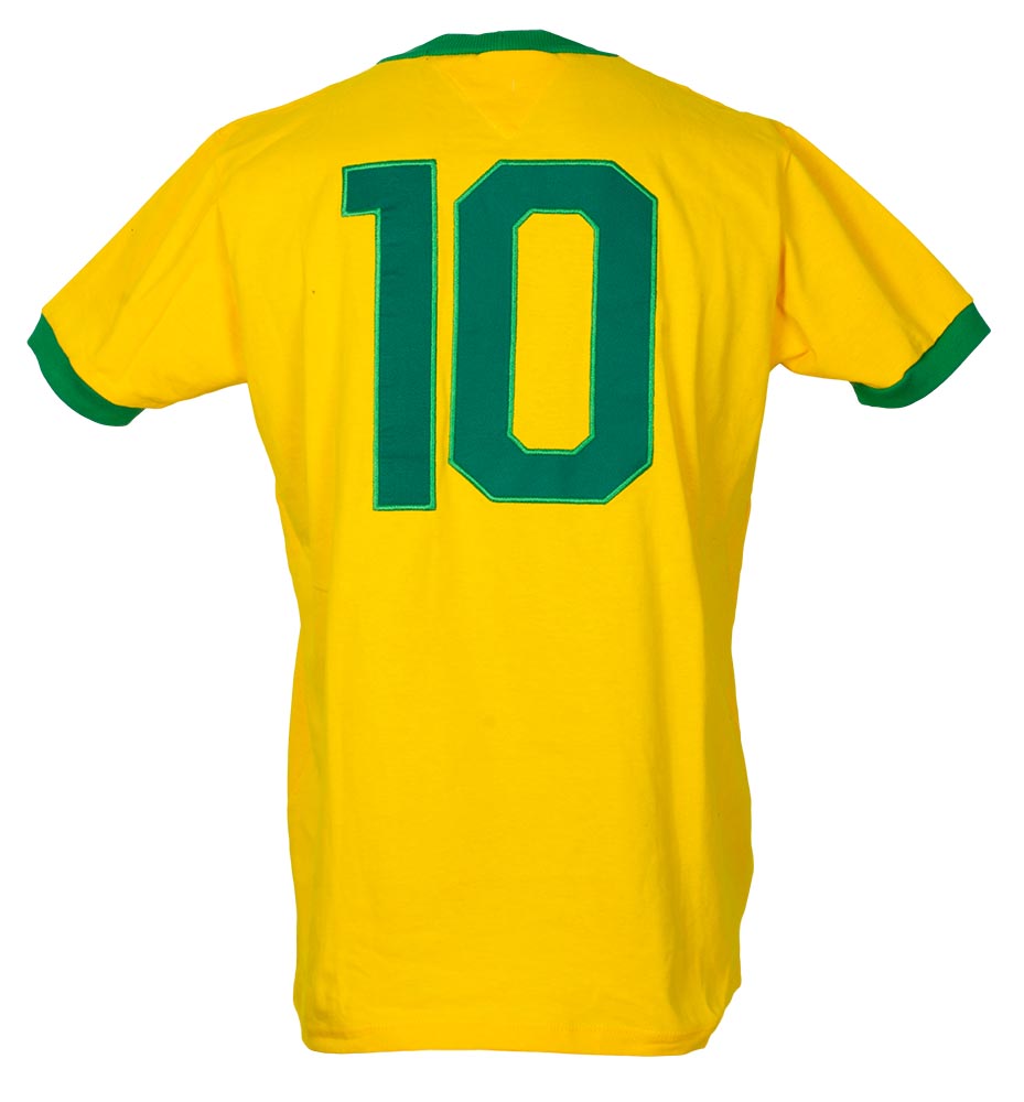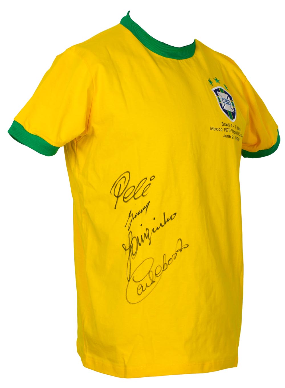 Athleta on-field style jersey. Everything is sewn on, size XL. Has been hand-signed in black felt-tip pen by Pele, Gerson, Jairzinho, and Carlos Alberto Torres (D. 2016).