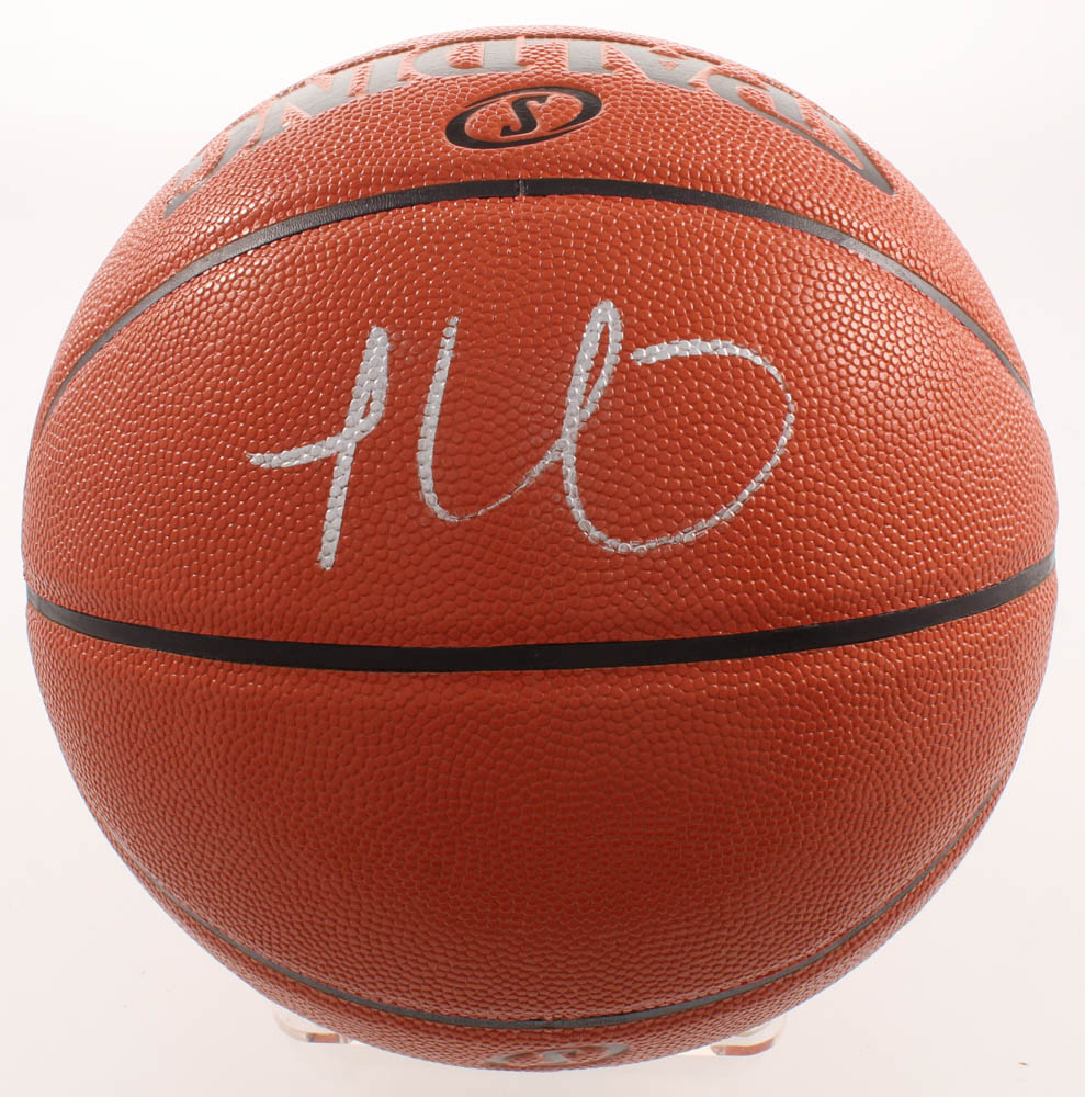 Spalding NBA Game Ball Series Basketball. Has been hand-signed in silver paint pen by James Harden (Houston Rockets).