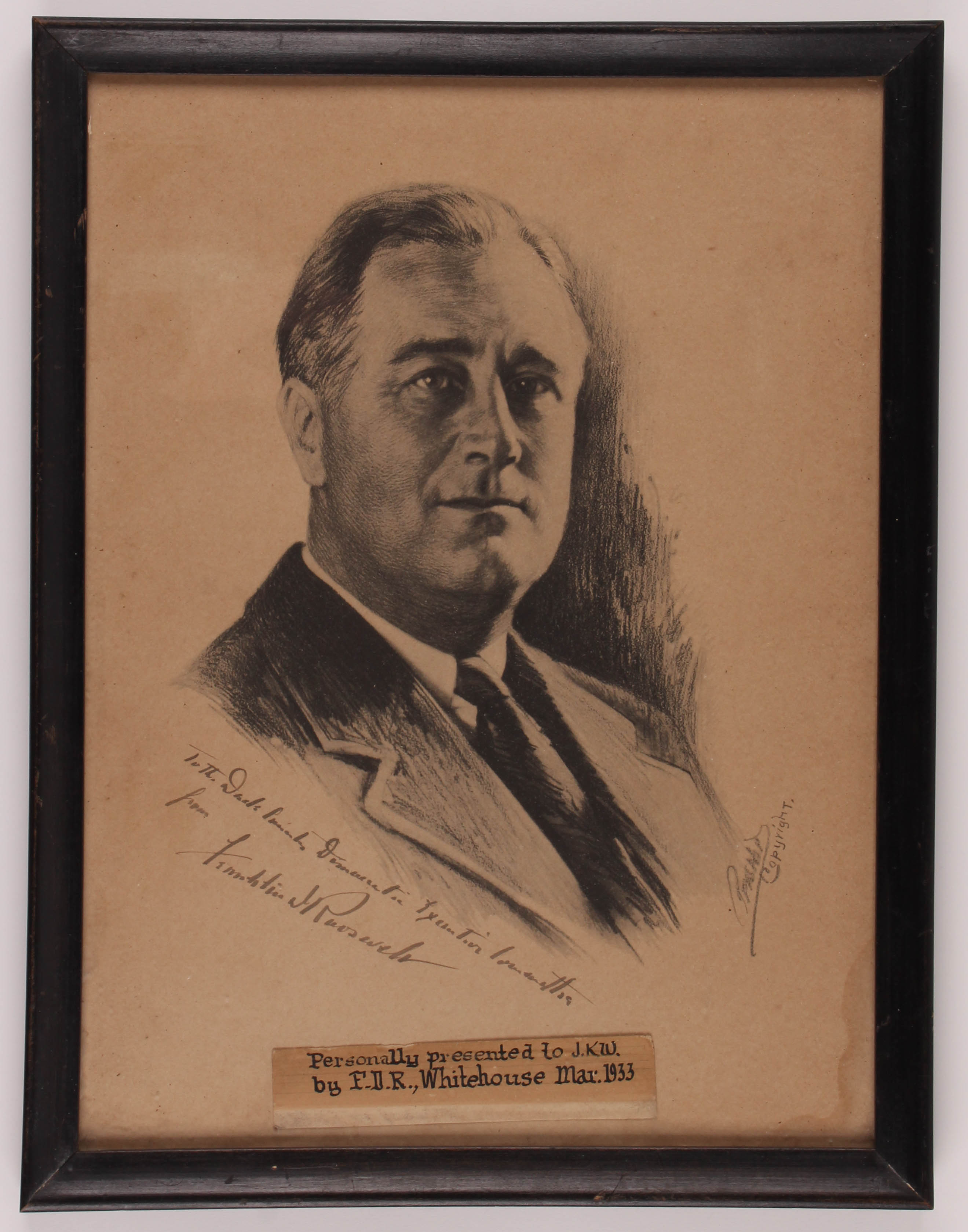 Custom frame measures 13' x 17" in size and features a print that has been hand-signed in black ink pen by Franklin D. Roosevelt (D. 1945).