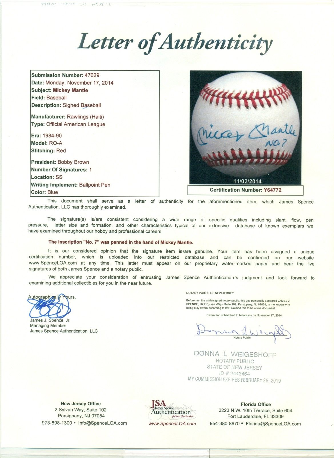 Mickey Mantle Signed OAL Baseball Inscribed "No. 7" (JSA LOA)