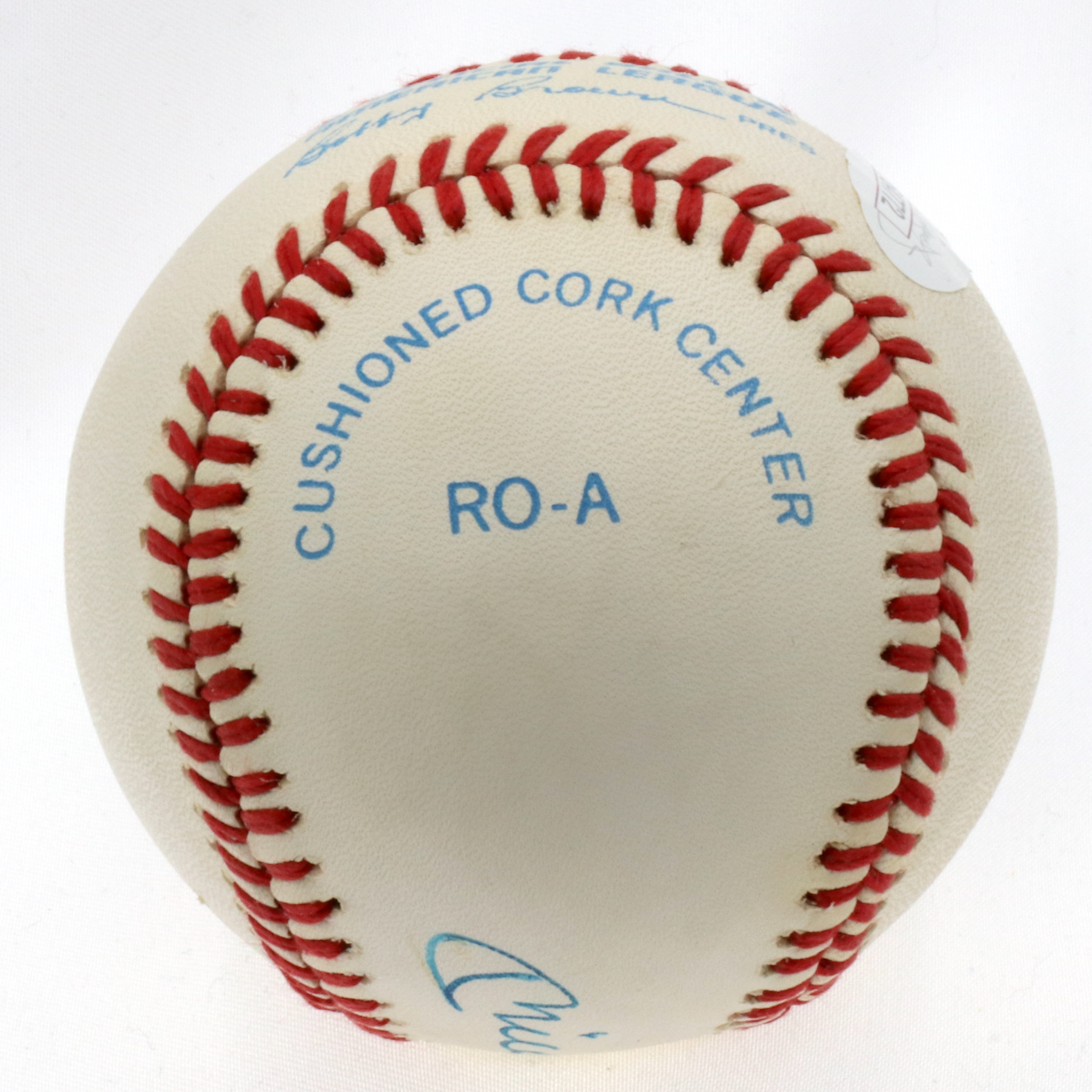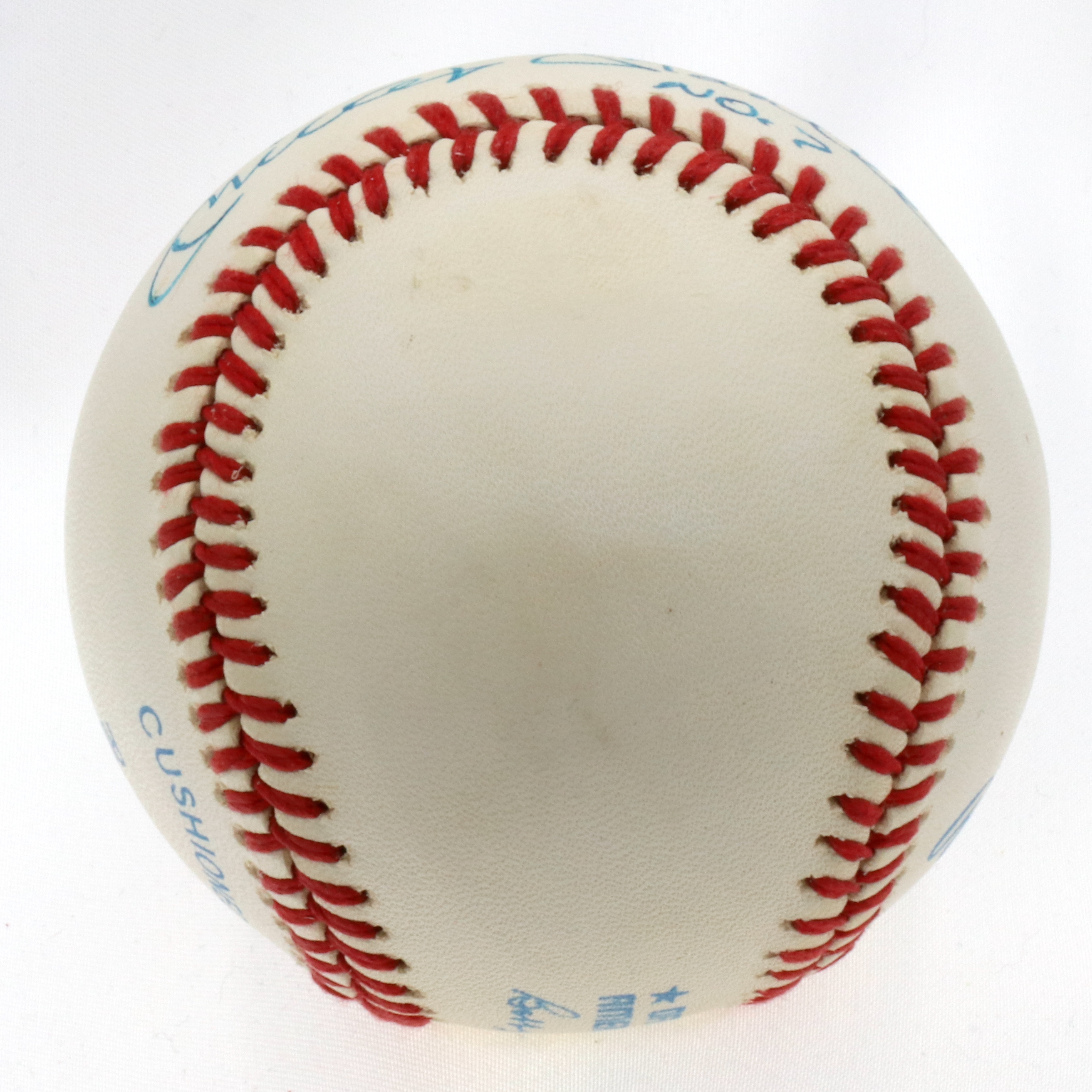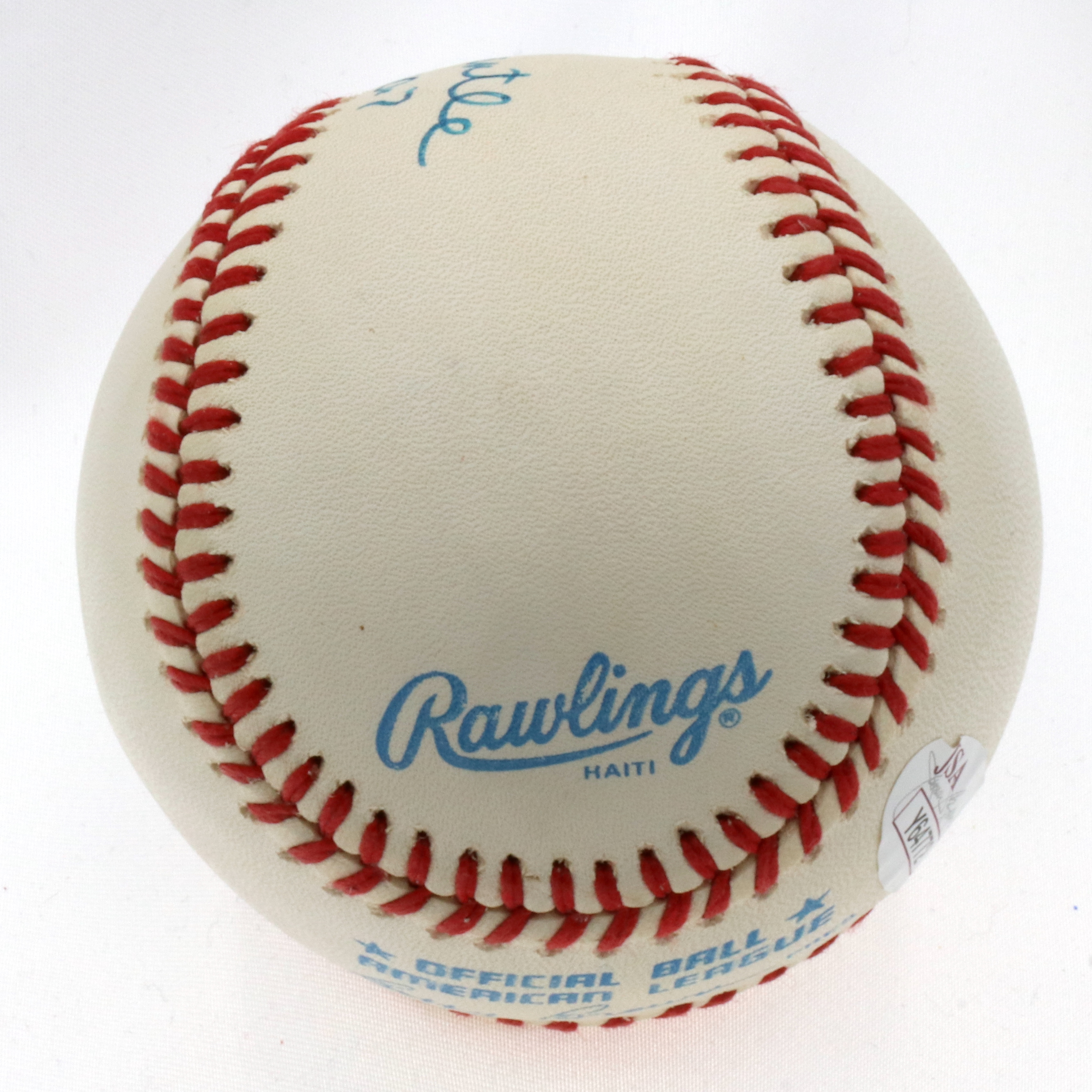 Rawlings Official American Baseball. Hand-signed and inscribed in blue ink pen by Mickey Mantle (D. 1995, New York Yankees, HOF). Please note, the baseball shows minor signs of natural toning.