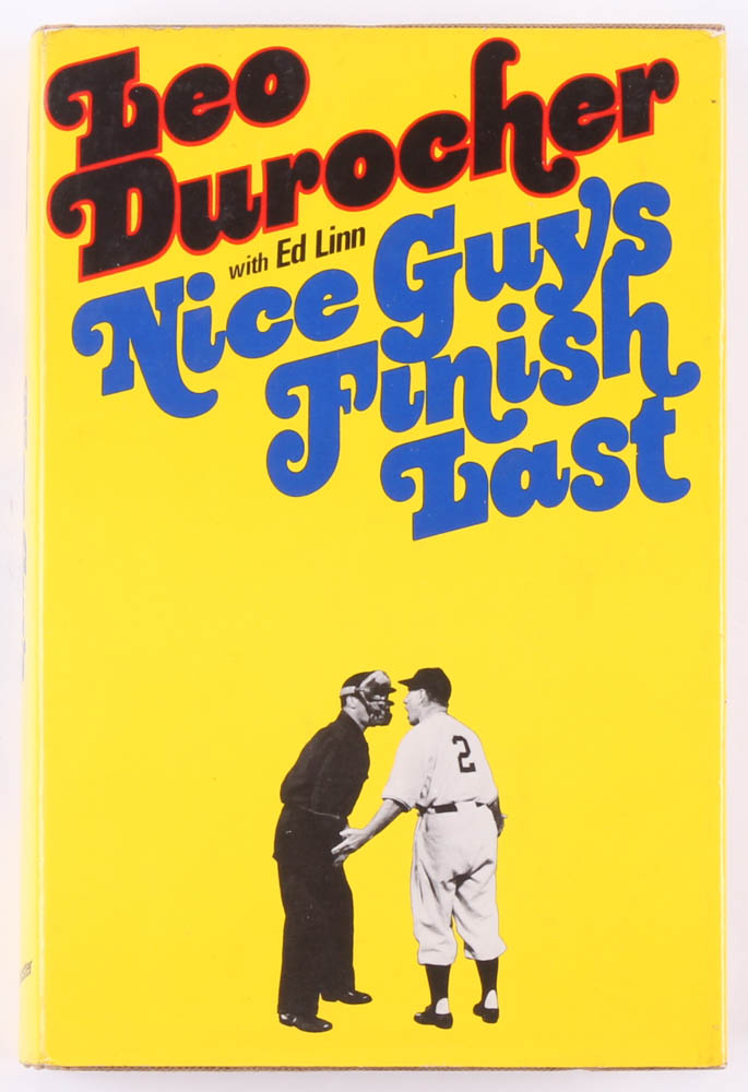 "Nice Guys Finish Last" hardcover book has been hand-signed in blue ink pen on the inside cover page by Leo Durocher (D. 1991, Brooklyn Dodgers, HOF).