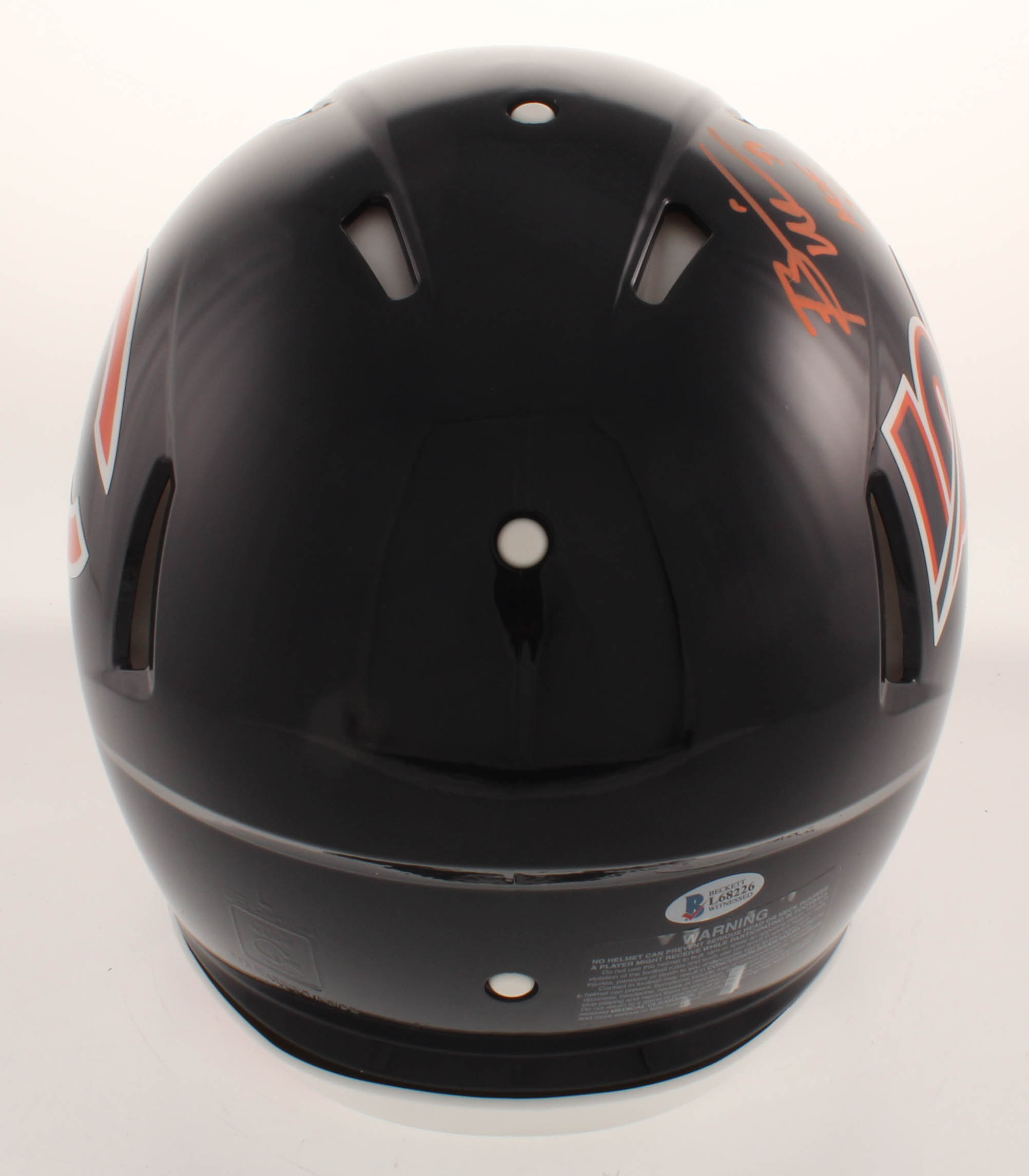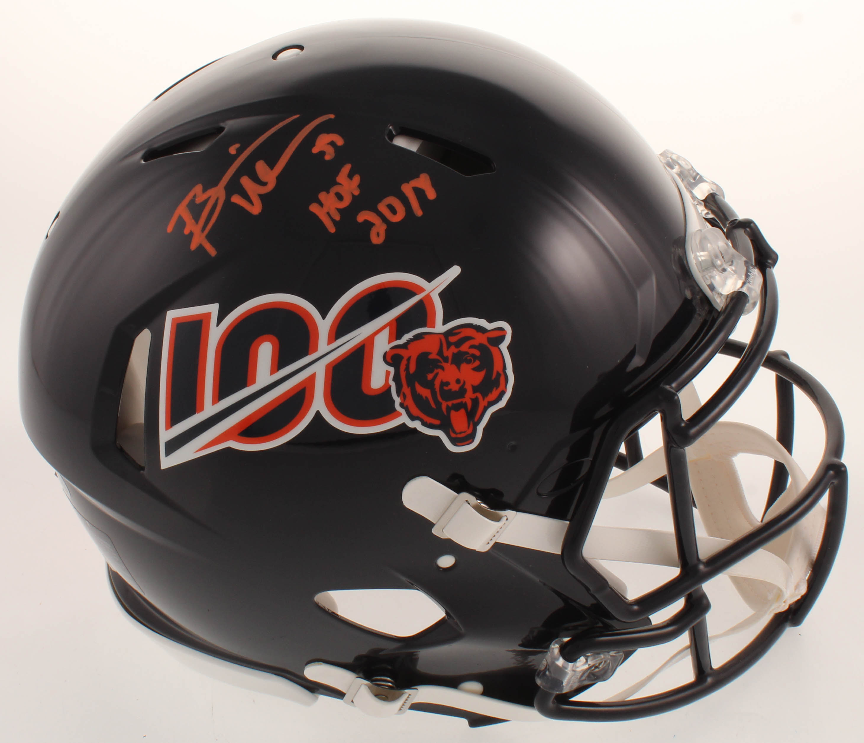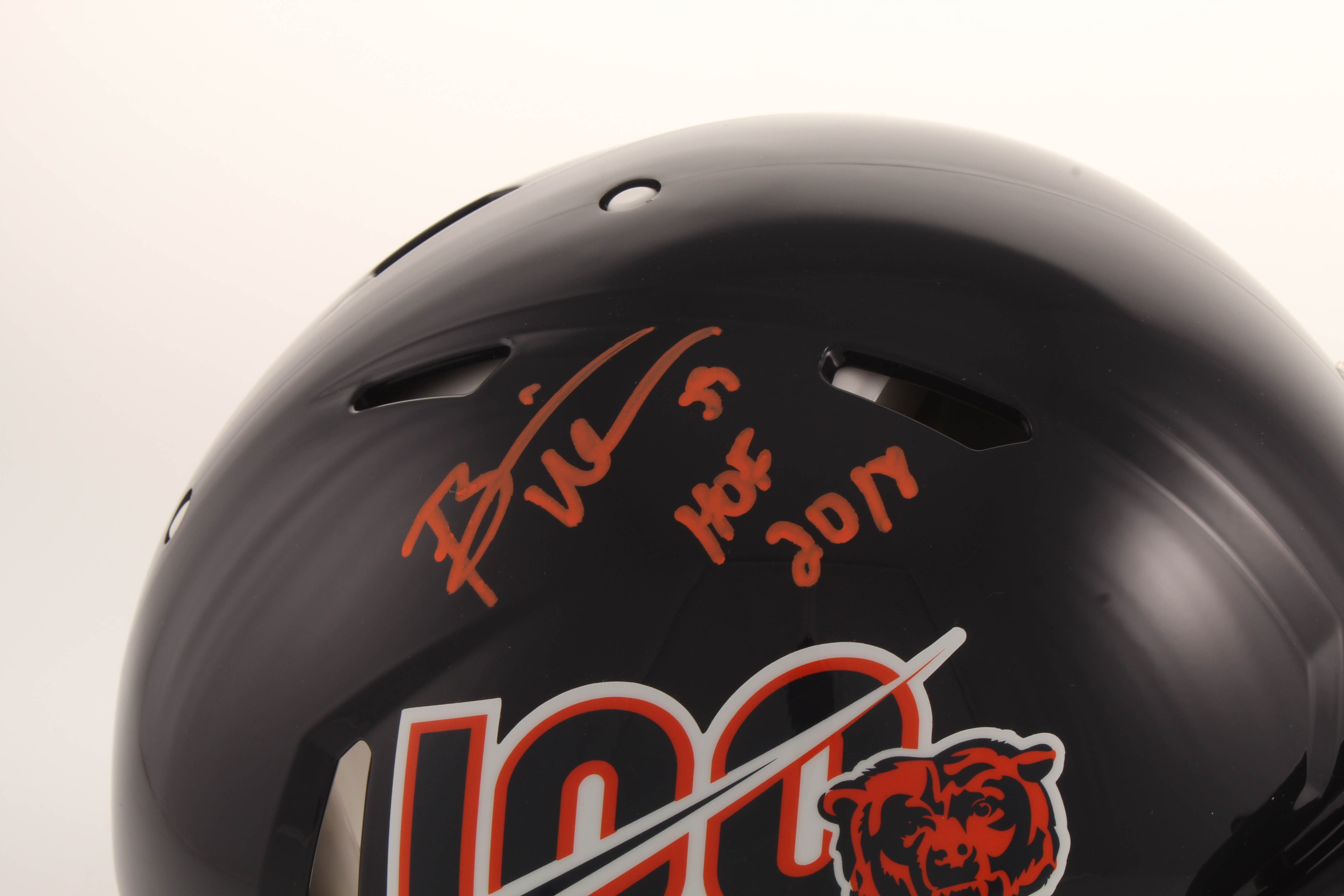 Riddell Chicago Bears full-size authentic on-field speed helmet. Hand-signed in orange paint pen by Brian Urlacher (HOF).