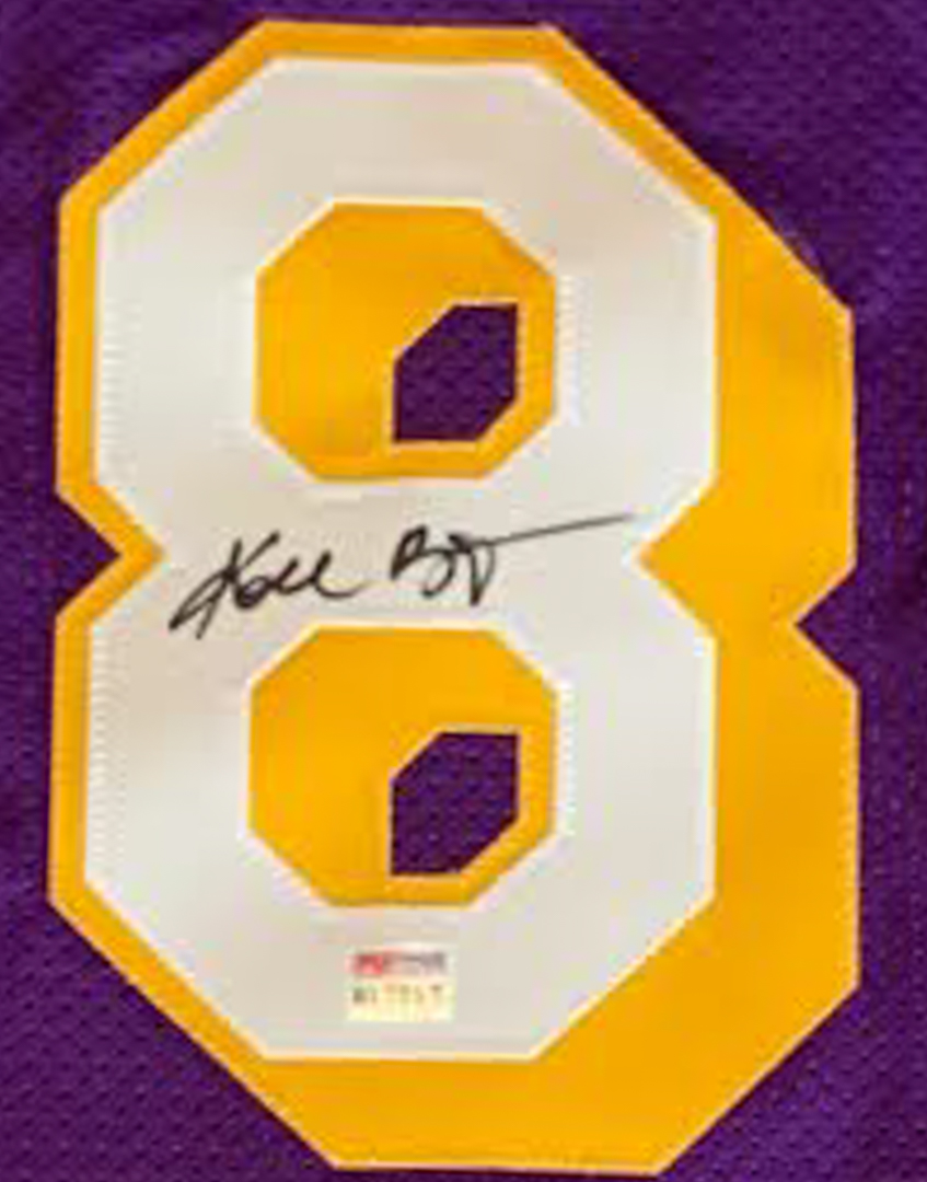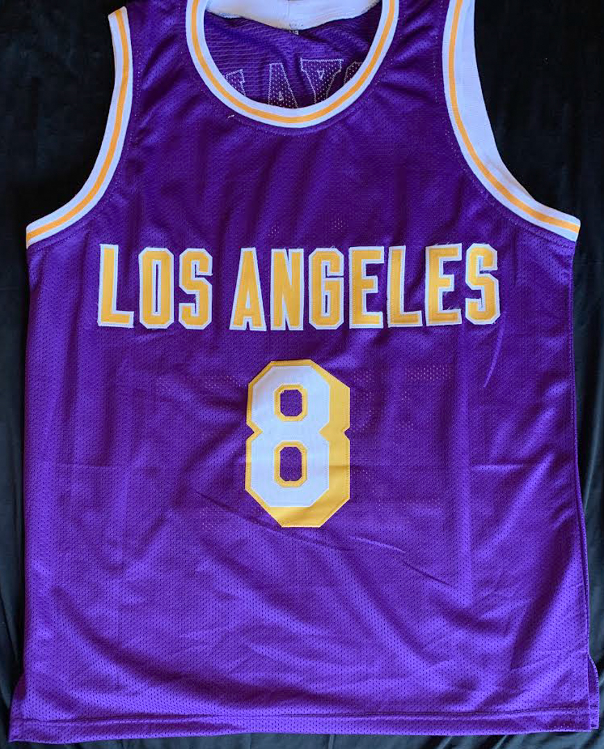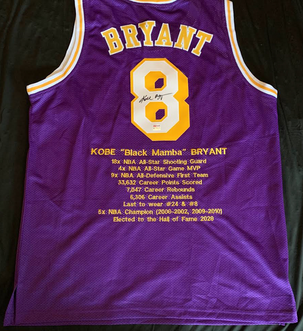 Custom on-court style jersey. Everything is sewn on, size XL. Hand-signed in black felt-tip pen by Kobe Bryant (D. 2020, Los Angeles Lakers). Bryant's career highlights have been custom stitched onto the back of the jersey below the reverse numbers.