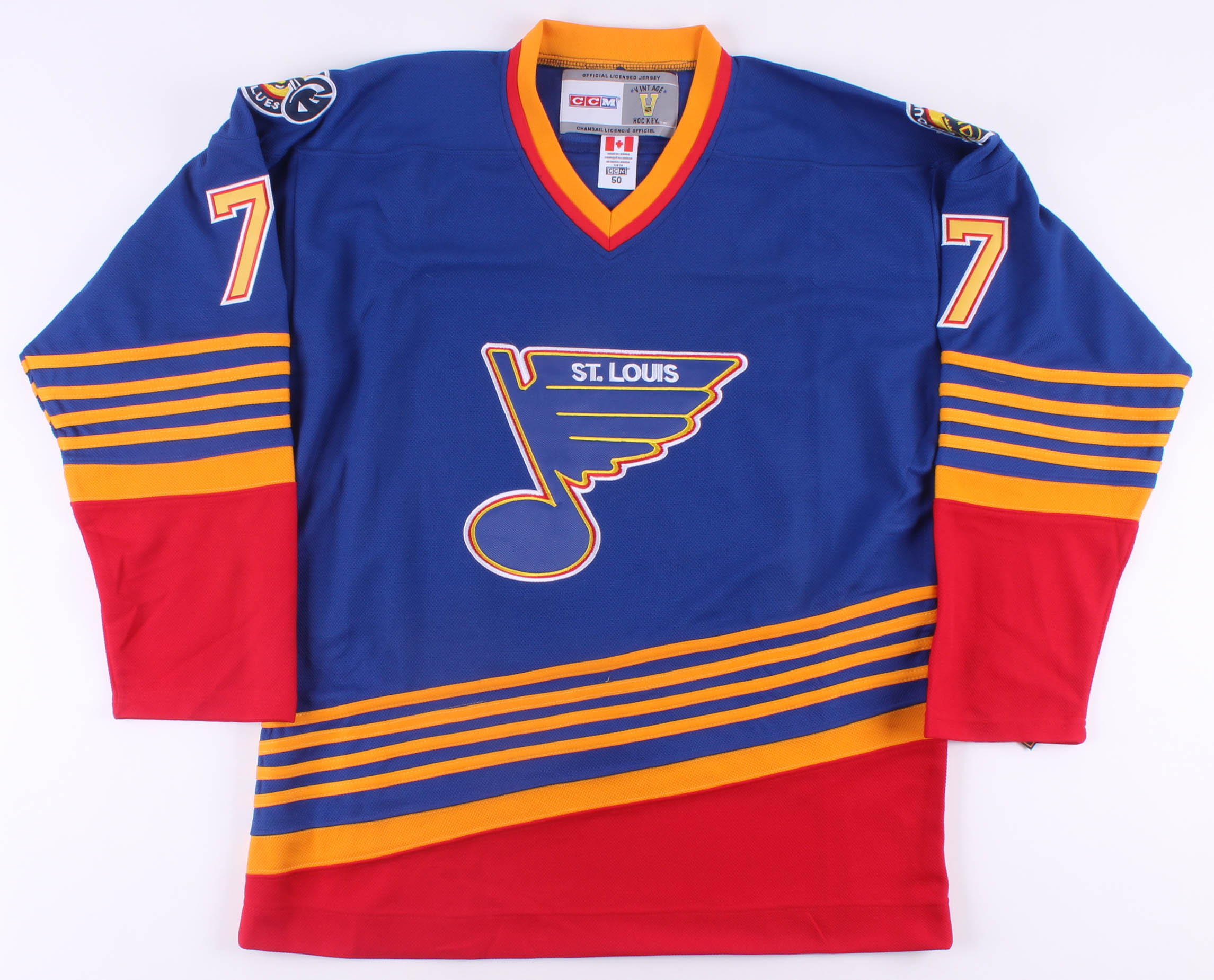 CCM on-ice style jersey. Everything is sewn on, size XL. Hand-signed in black felt-tip pen by Pierre Turgeon (St. Louis Blues).