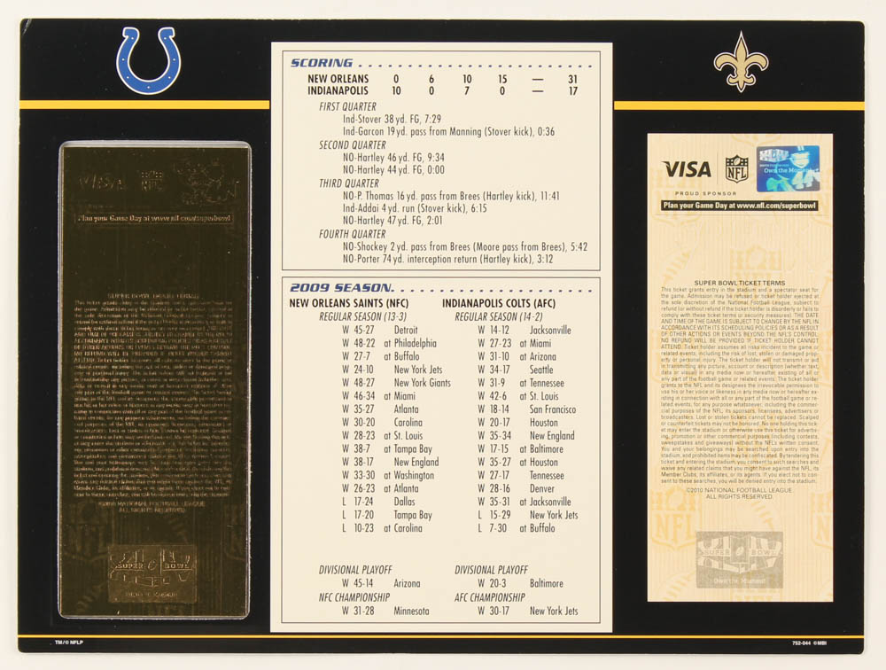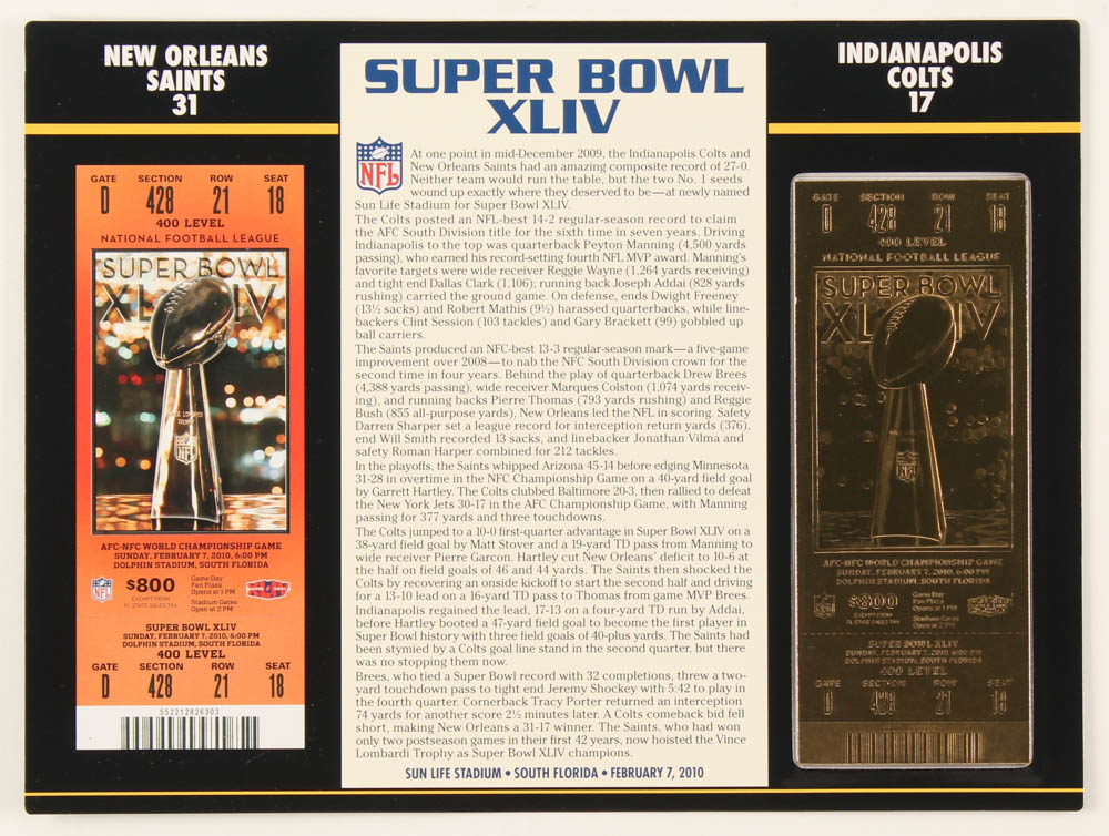 Super Bowl XLIV Commemorative Score Card with 23kt Gold Ticket